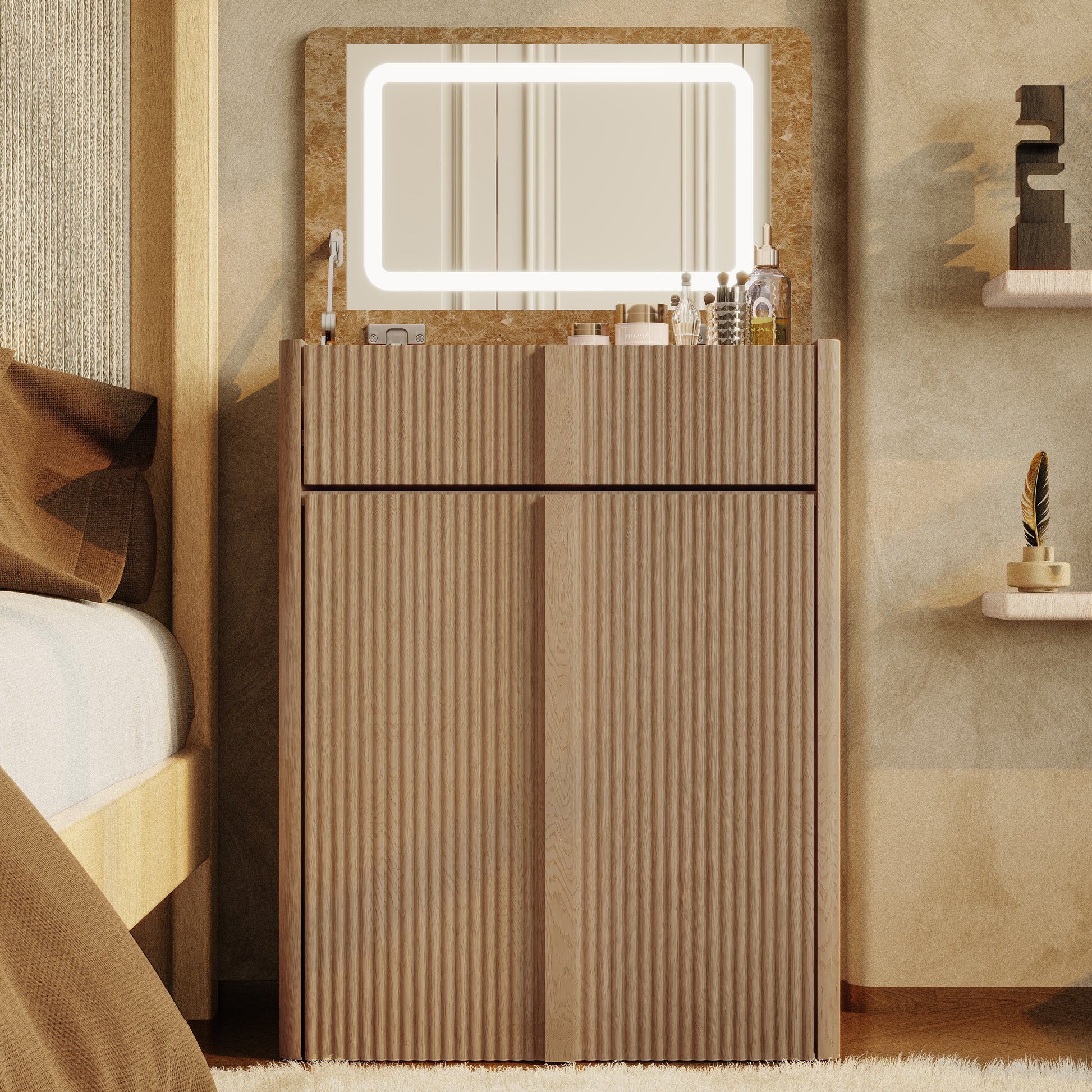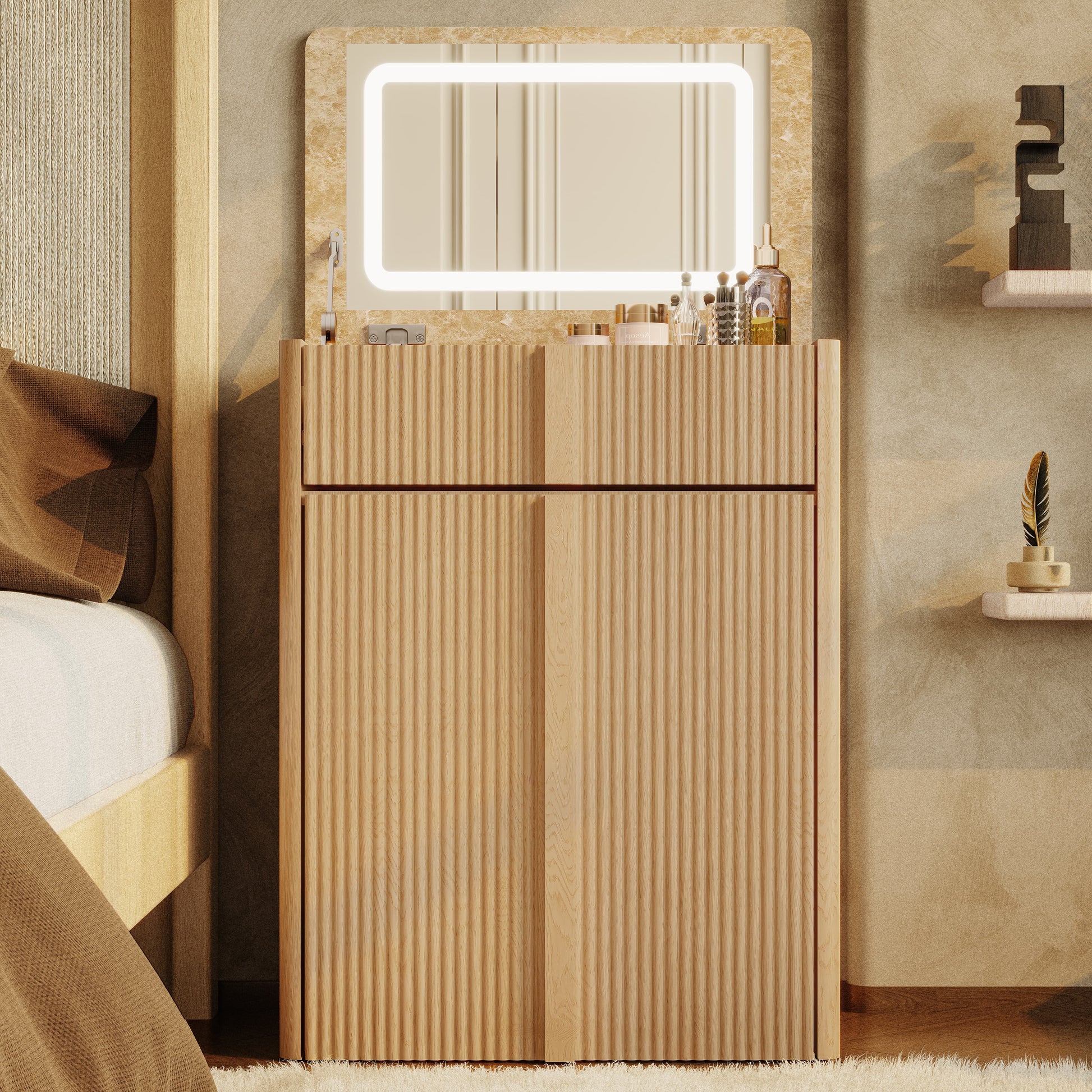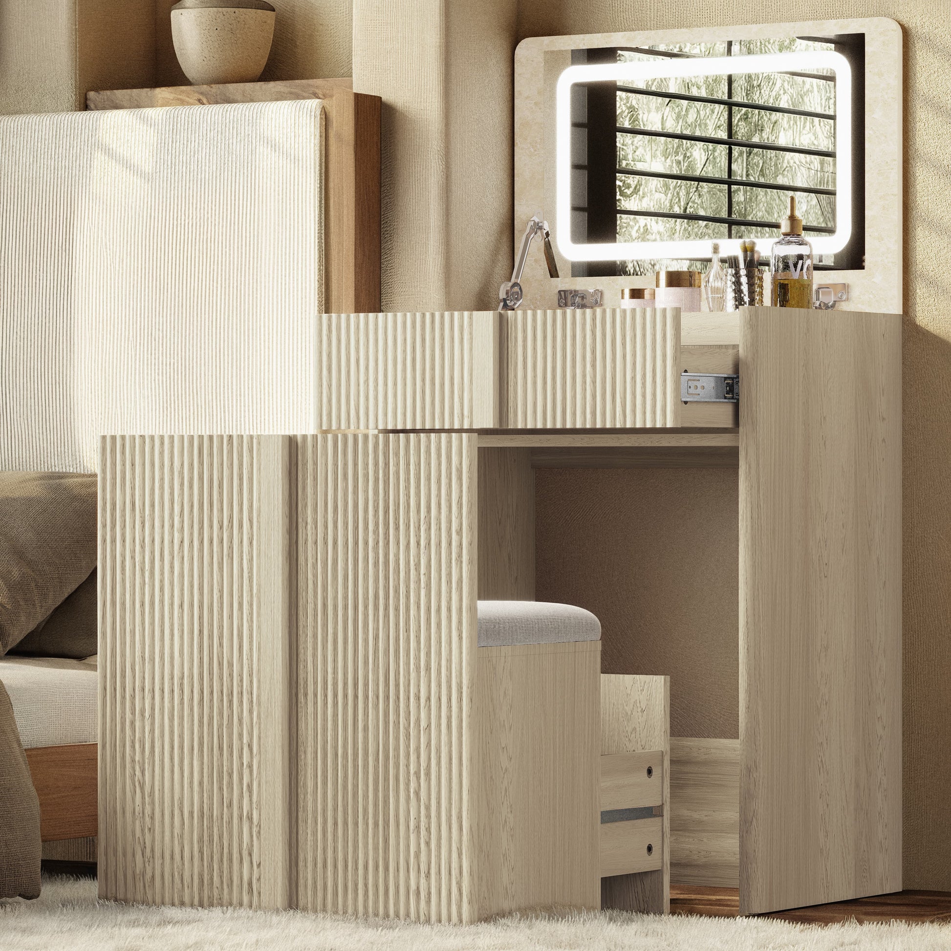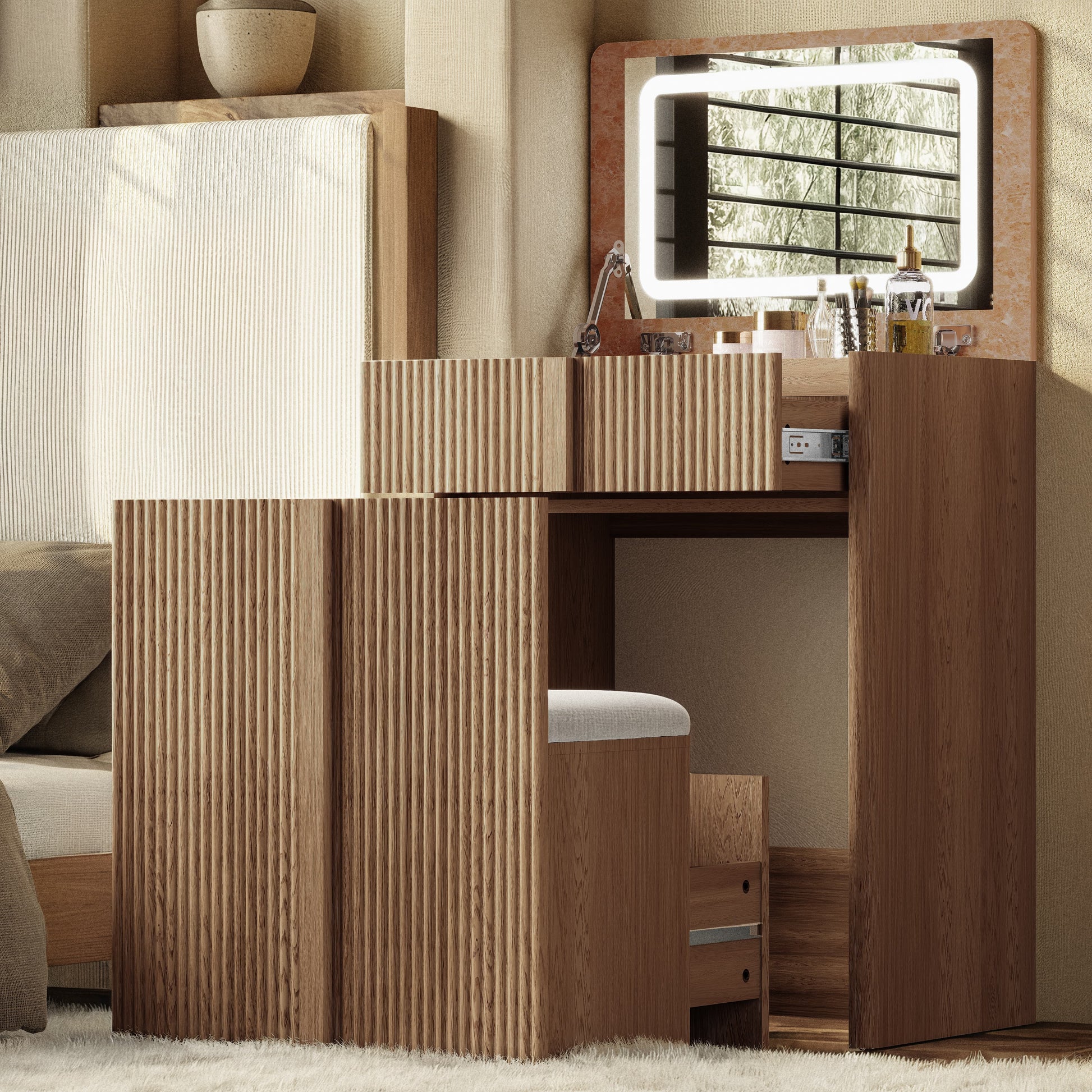- Sleek Curved Vanity with Storage. The arc-shaped 3 in 1 vanity desk enhances bedroom ambiance with its soft contours. Featuring 3D wave-groove detailing and marble-finish surfaces, crafted from engineered wood, it combines minimalist aesthetics with functionality. Rounded corners provide added safety, while its versatile design complements contemporary to mid-century styles