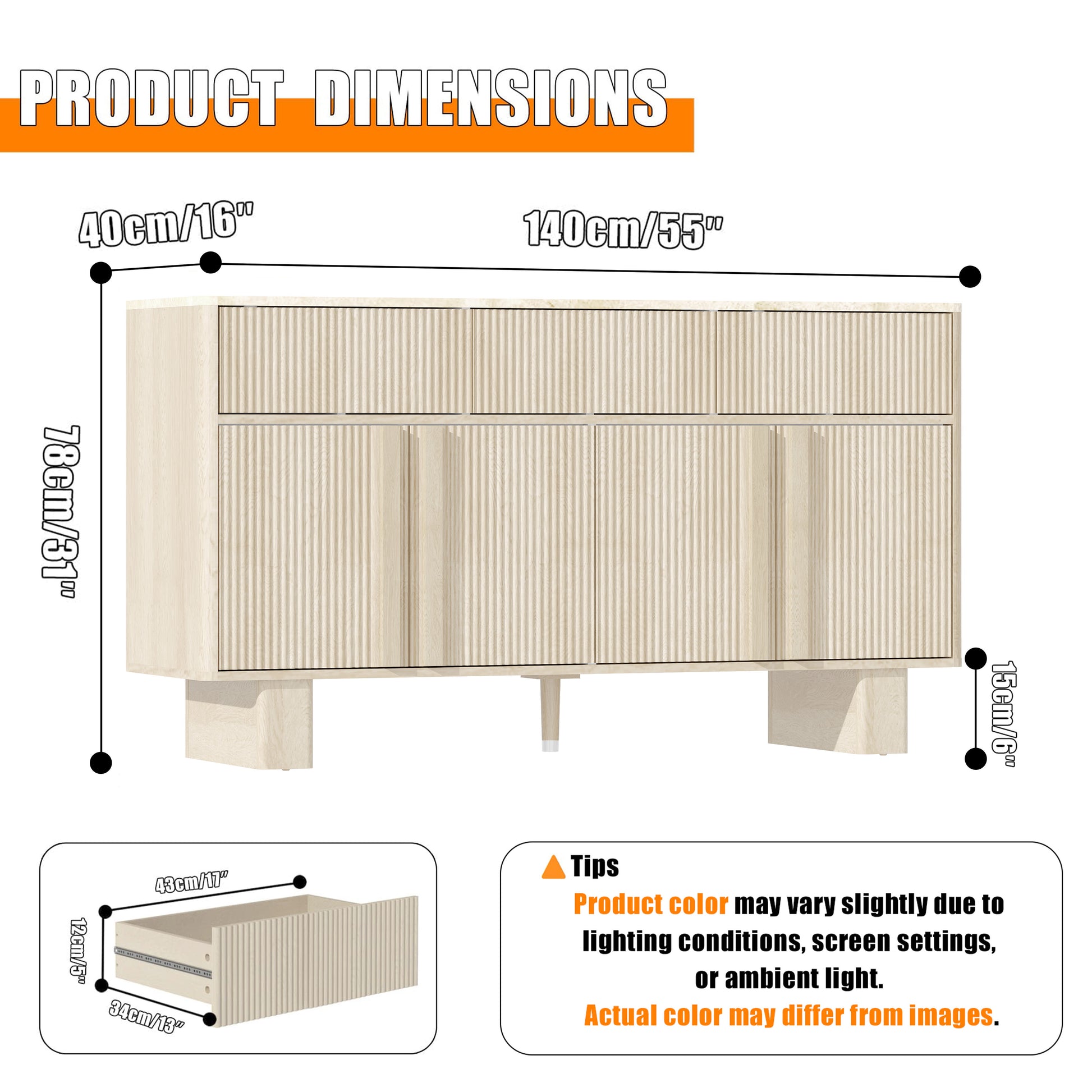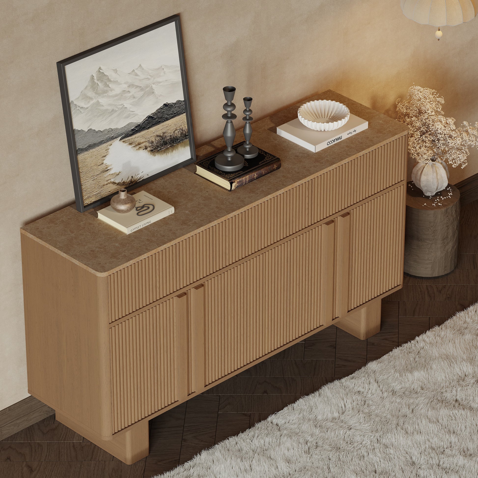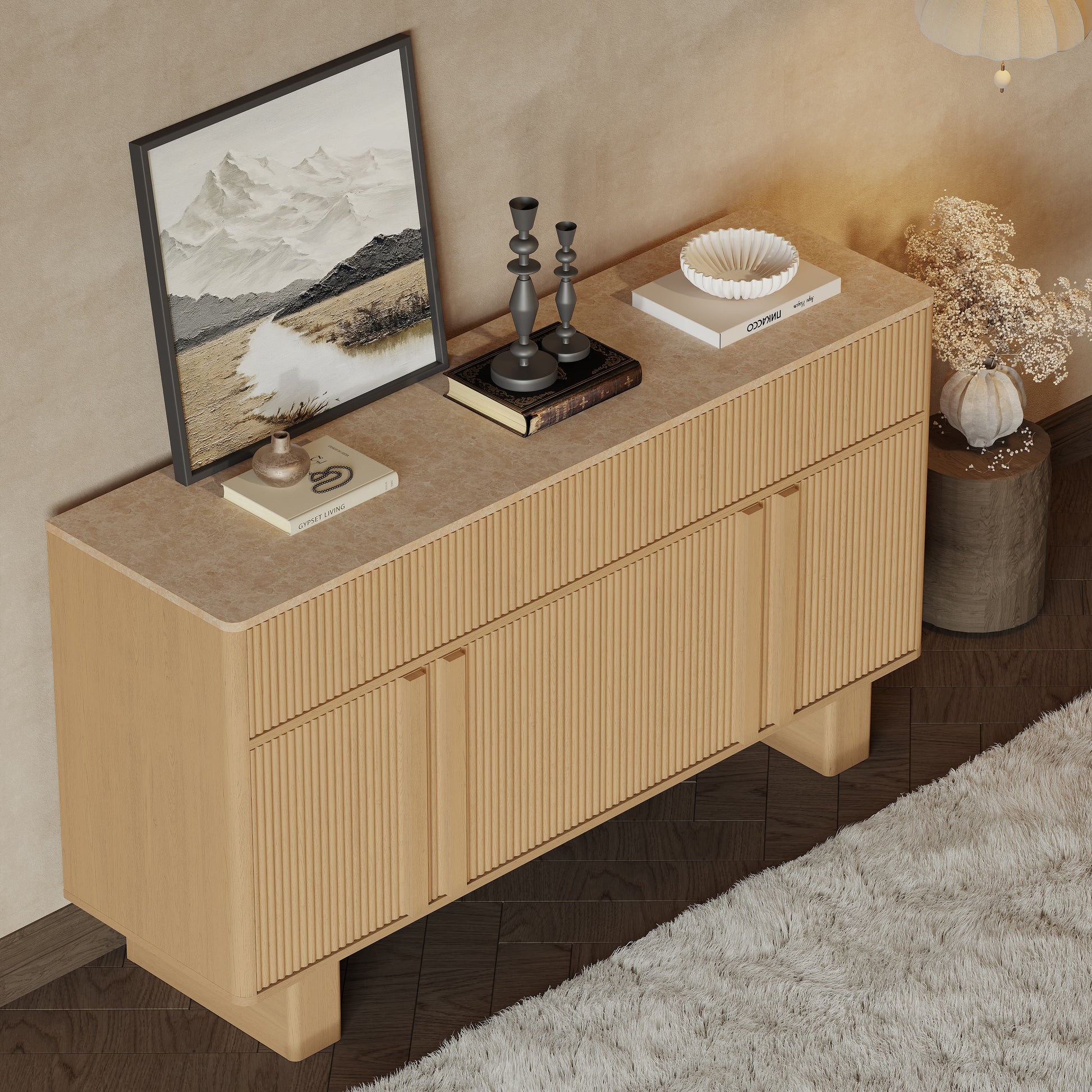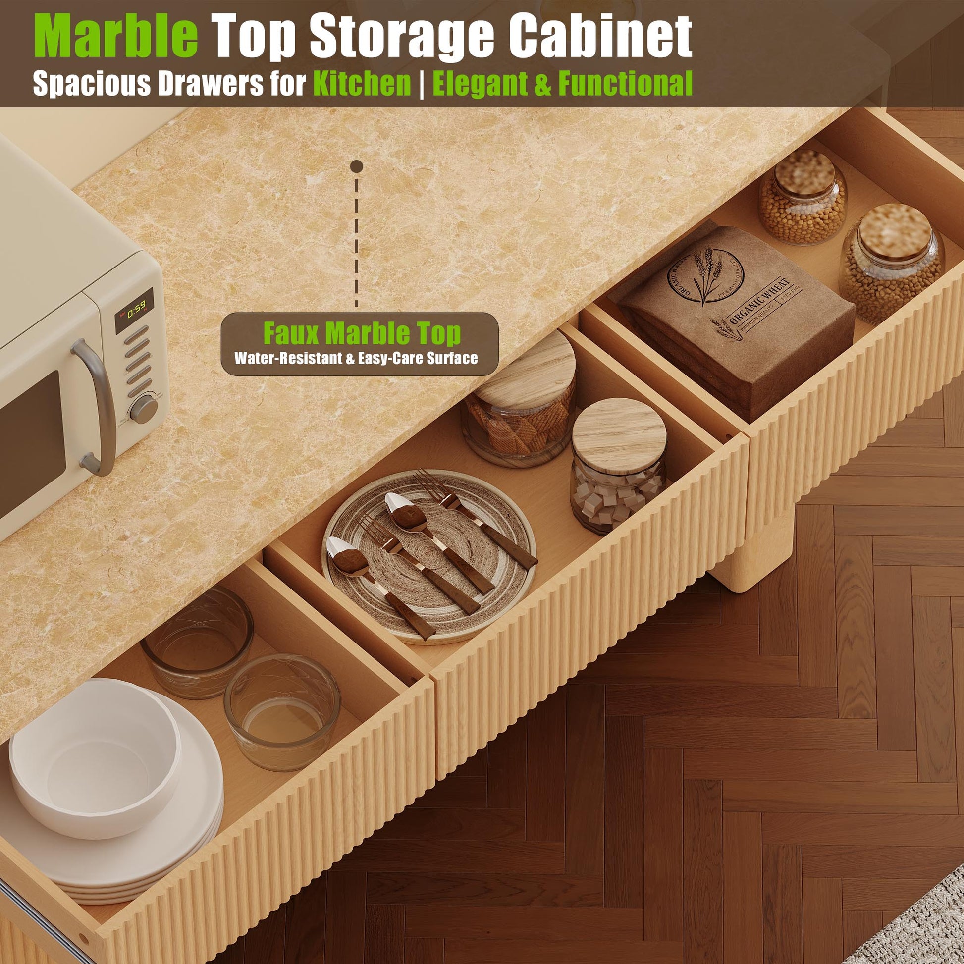 - Sleek Curved Storage Cabinet: The arc-shaped buffet cabinet enhances the space with soft, curved contours. Featuring 3D wave-groove detailing and marble veneers, crafted from durable engineered hardwood, it merges minimalist aesthetics with practicality. Rounded corners enhance safety, while its versatile design complements contemporary to mid-century styles