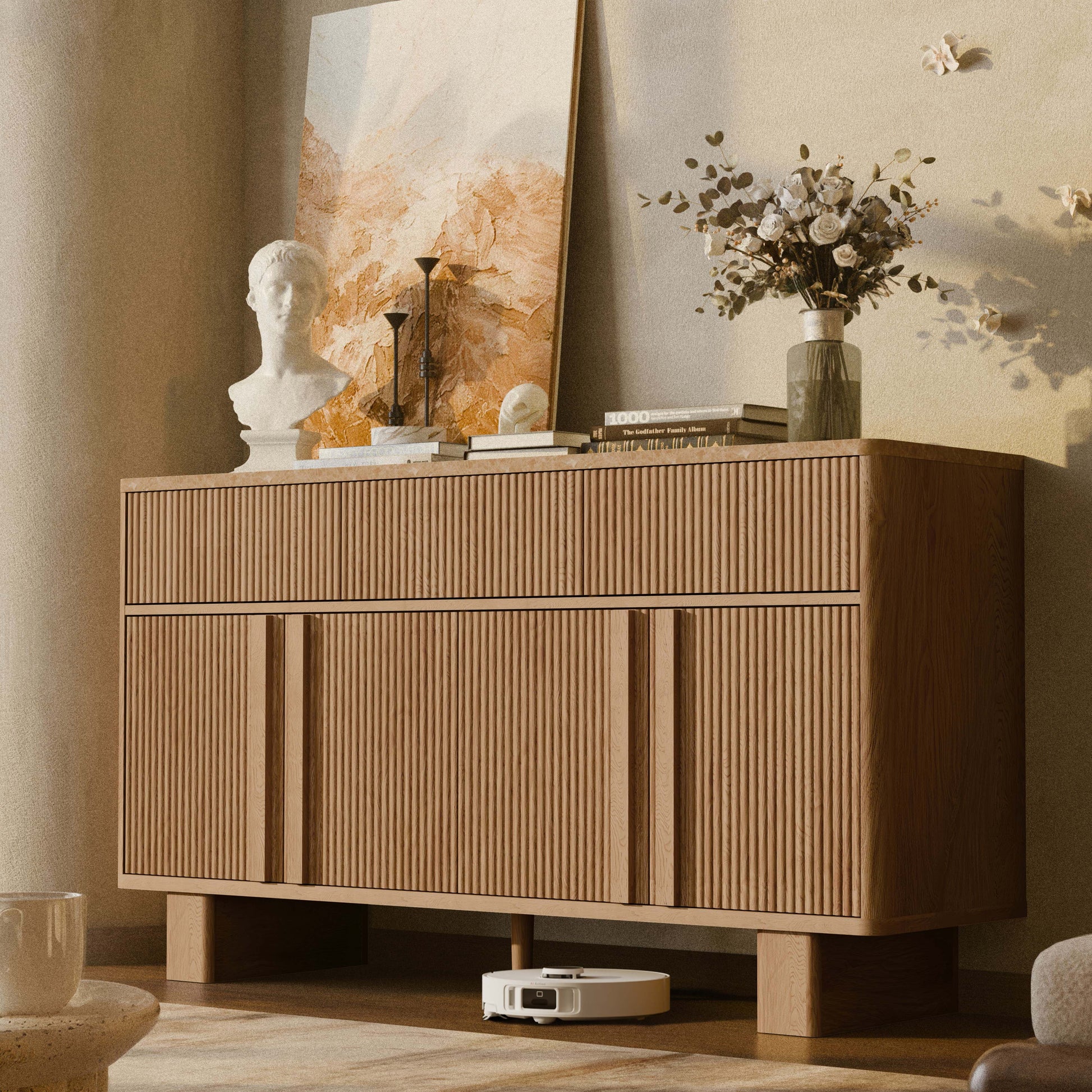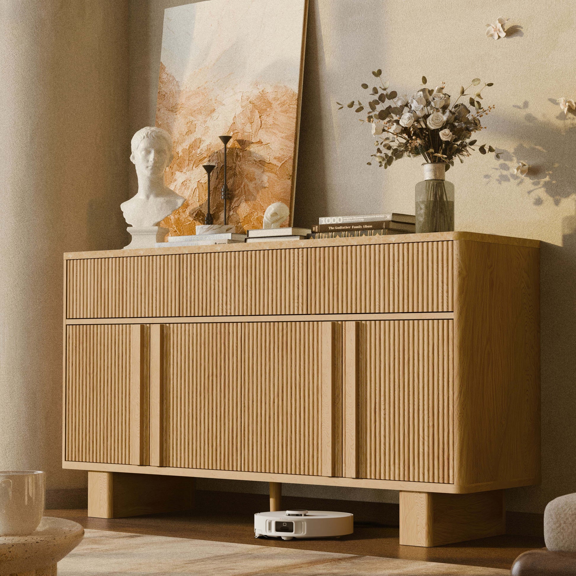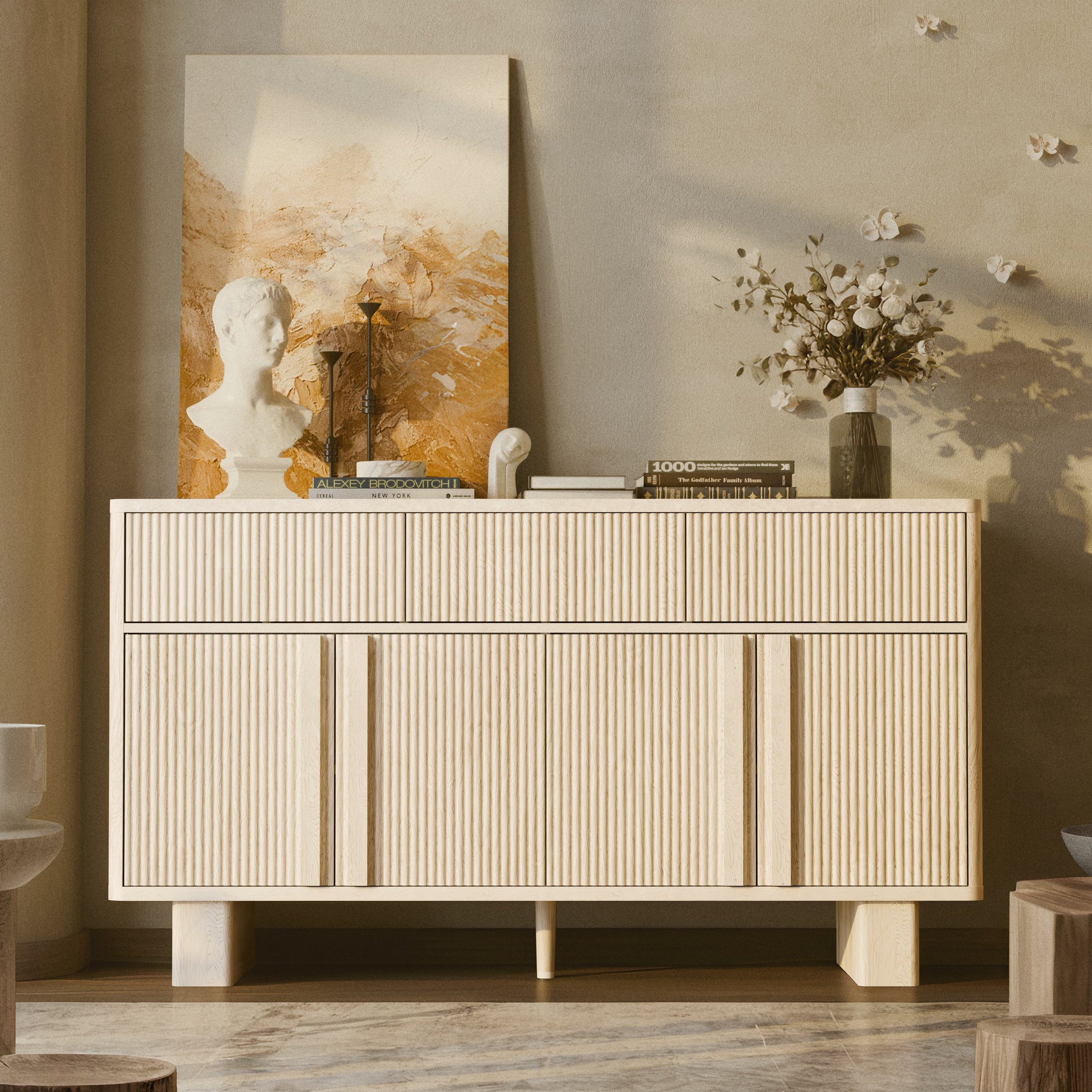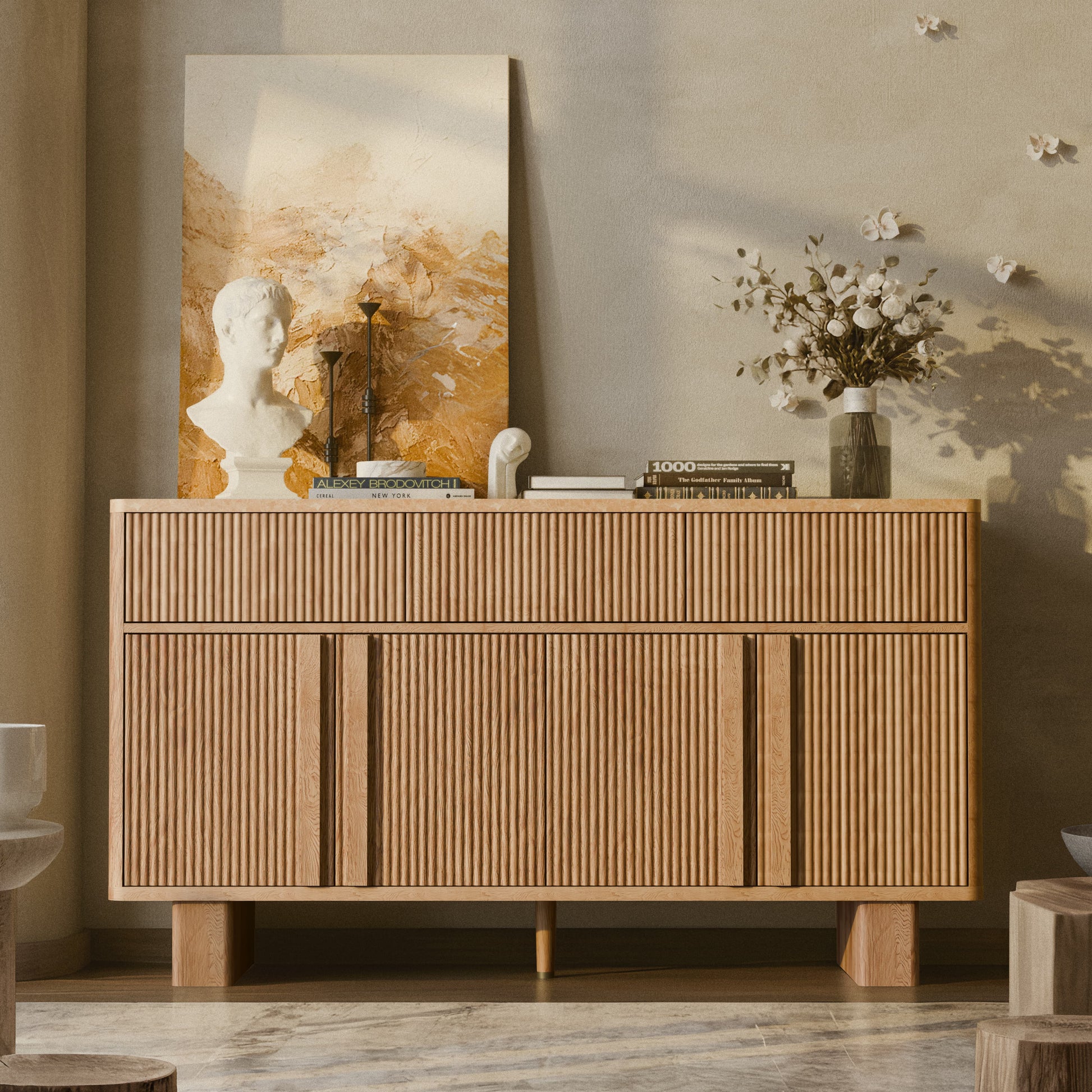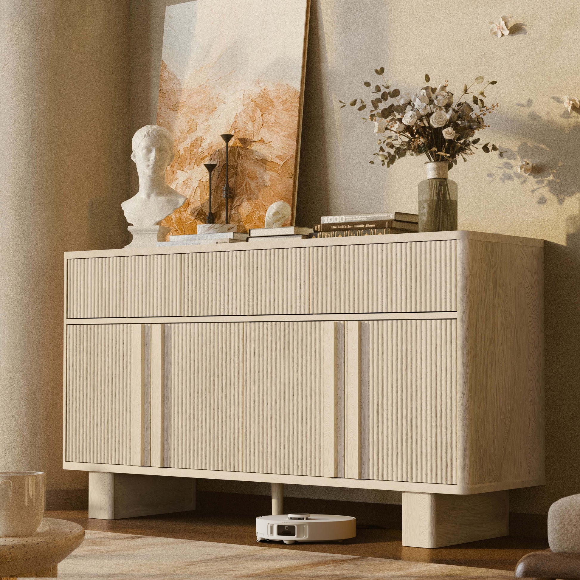 - Sleek Curved Storage Cabinet: The arc-shaped buffet cabinet enhances the space with soft, curved contours. Featuring 3D wave-groove detailing and marble veneers, crafted from durable engineered hardwood, it merges minimalist aesthetics with practicality. Rounded corners enhance safety, while its versatile design complements contemporary to mid-century styles