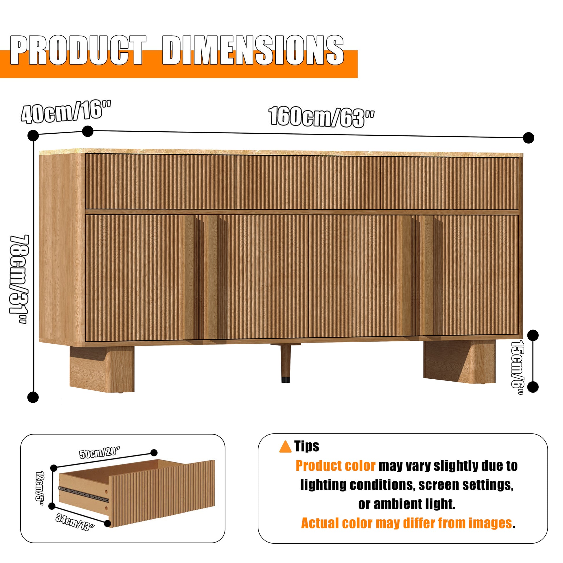 - Sleek Curved Storage Cabinet. The arc-shaped buffet cabinet enhances the space with soft contours. Featuring 3D wave-groove detailing and marble veneers, crafted from durable engineered hardwood, it merges minimalist aesthetics with practicality. Rounded corners enhance safety, while its versatile design complements contemporary to mid-century styles