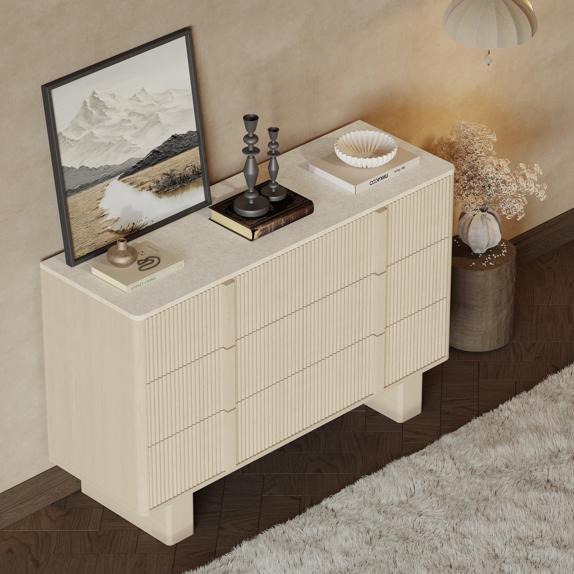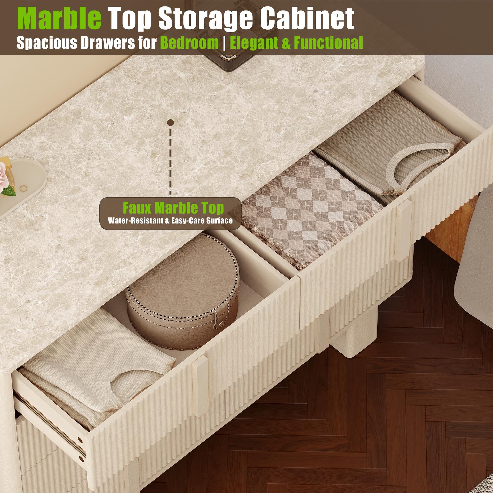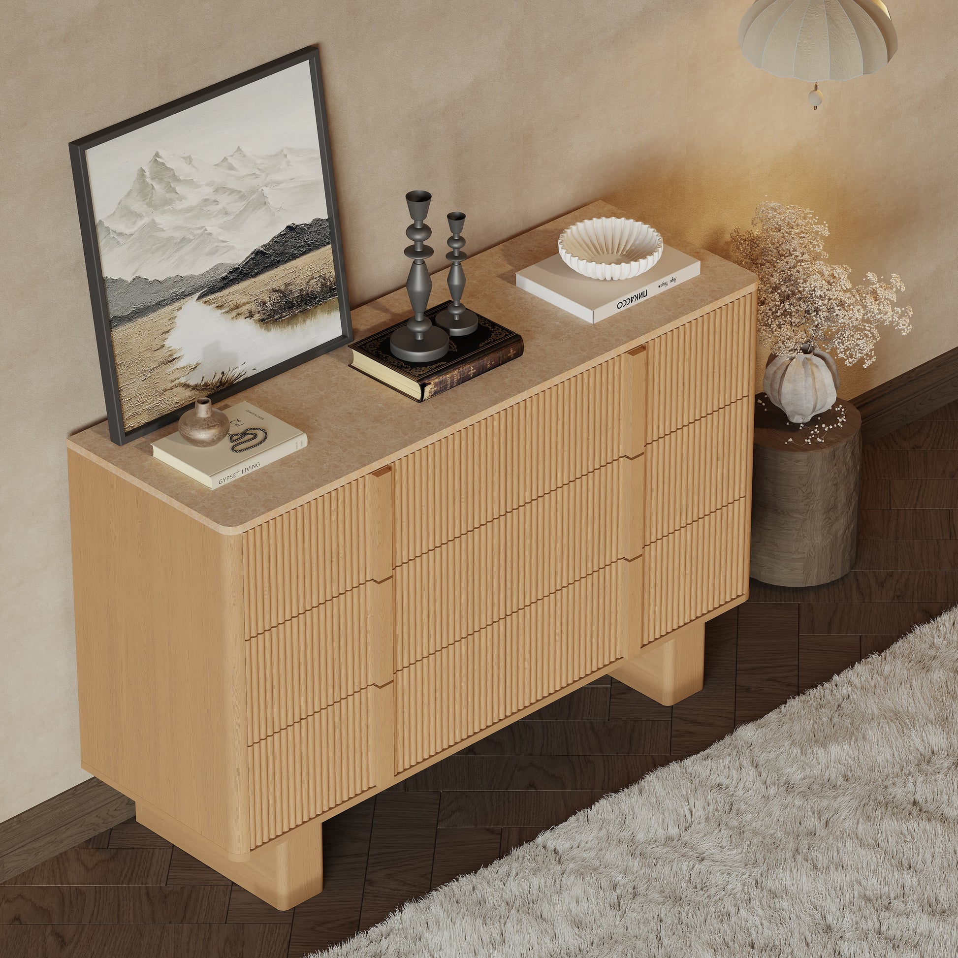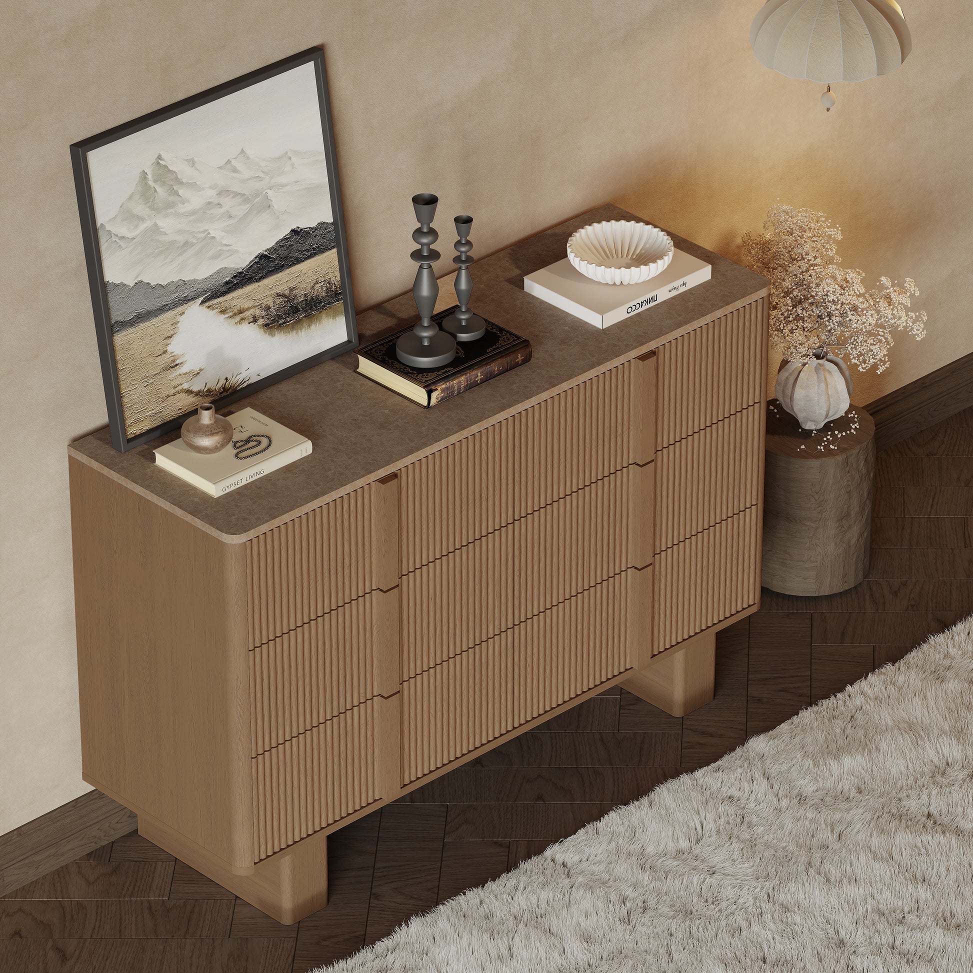 - Sleek Curved Dresser with 6 Drawers. The arc-shaped dresser elevates bedroom ambiance with its soft contours. Featuring 3D wave-groove detailing and marble veneers, crafted from engineered wood with high durability, it merges minimalist aesthetics with practicality. Rounded corners enhance safety, while its versatile design complements contemporary to mid-century styles