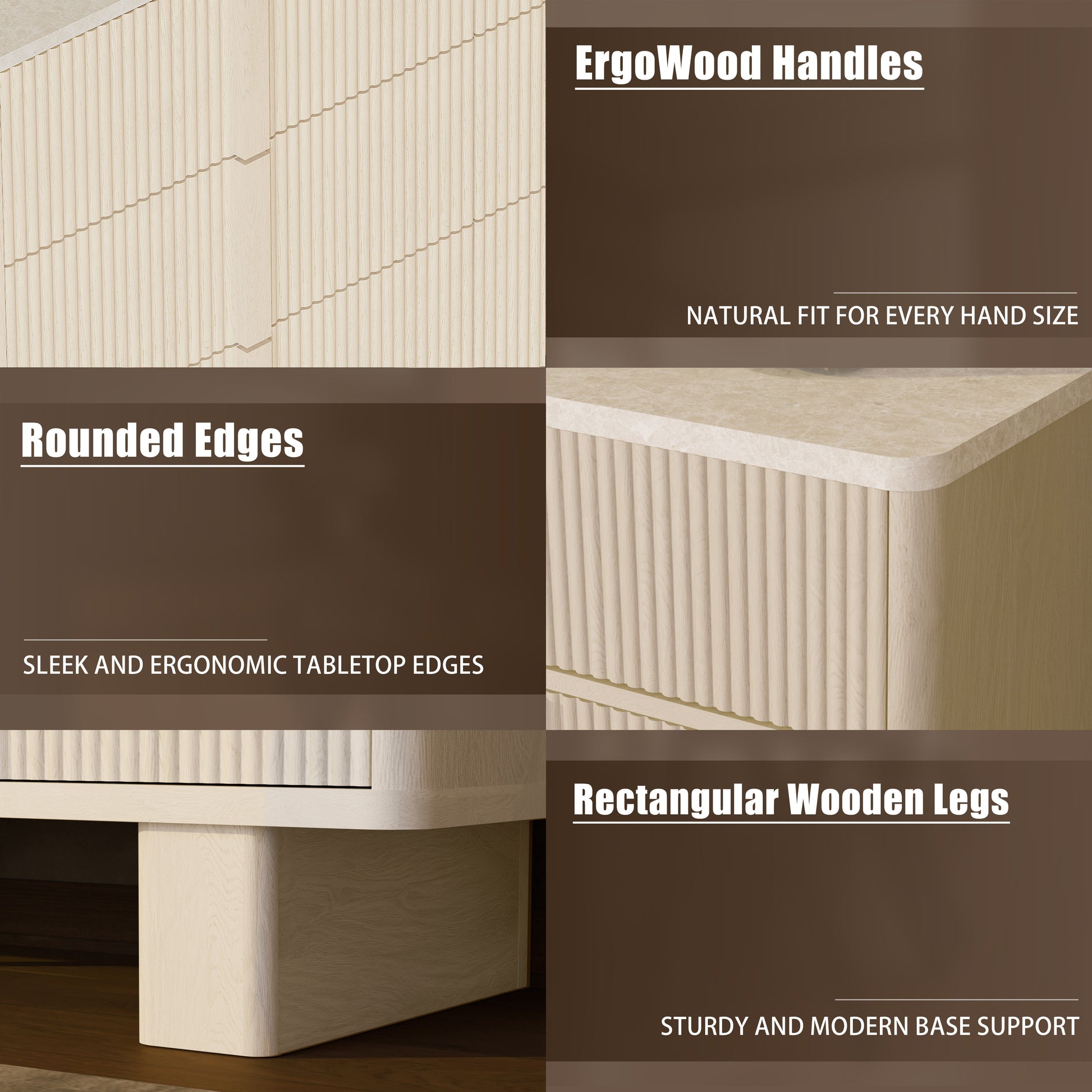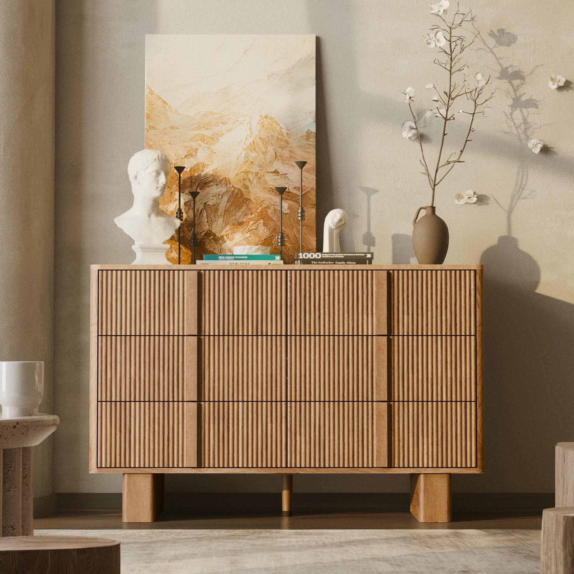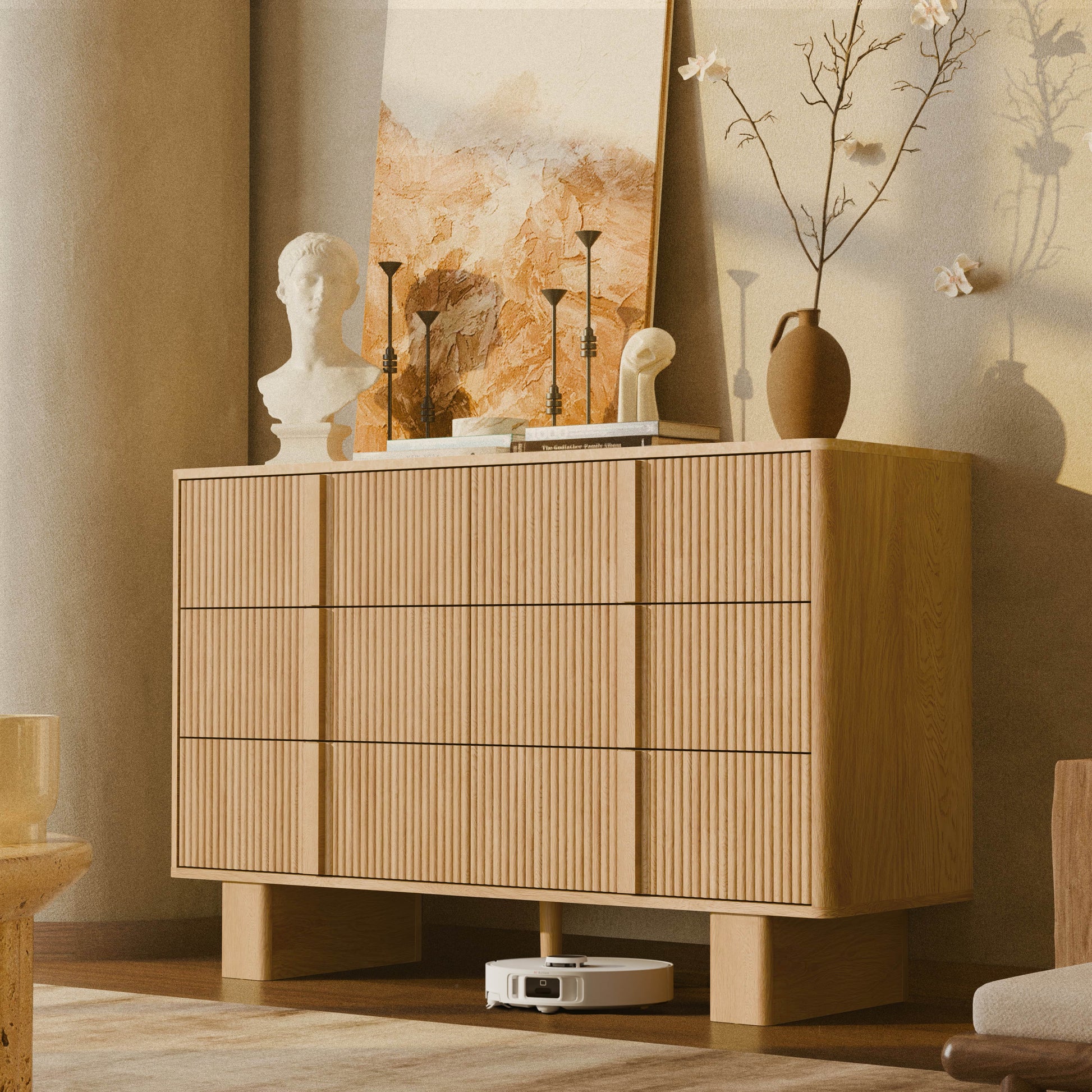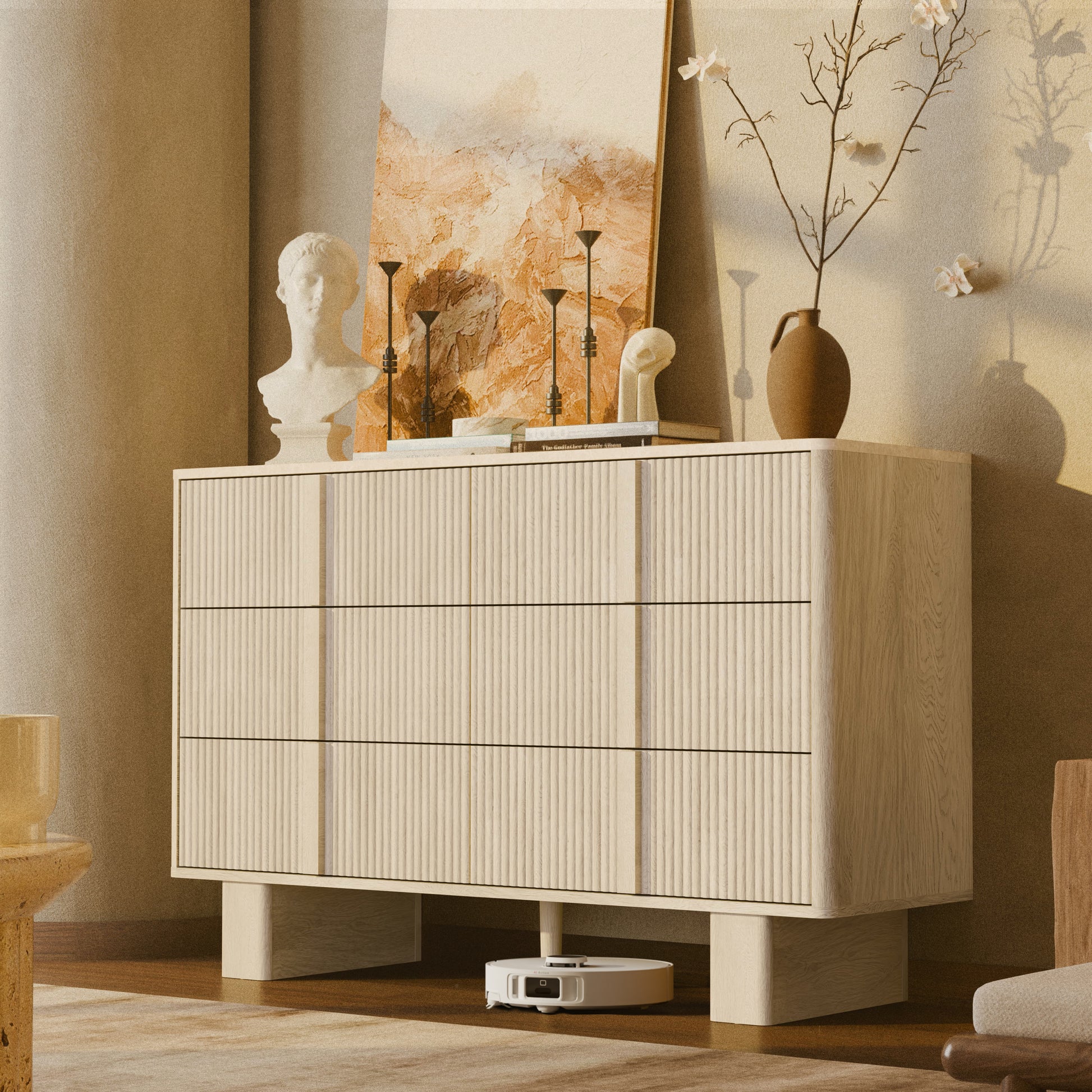 - Sleek Curved Dresser with 6 Drawers. The arc-shaped dresser elevates bedroom ambiance with its soft contours. Featuring 3D wave-groove detailing and marble veneers, crafted from engineered wood with high durability, it merges minimalist aesthetics with practicality. Rounded corners enhance safety, while its versatile design complements contemporary to mid-century styles