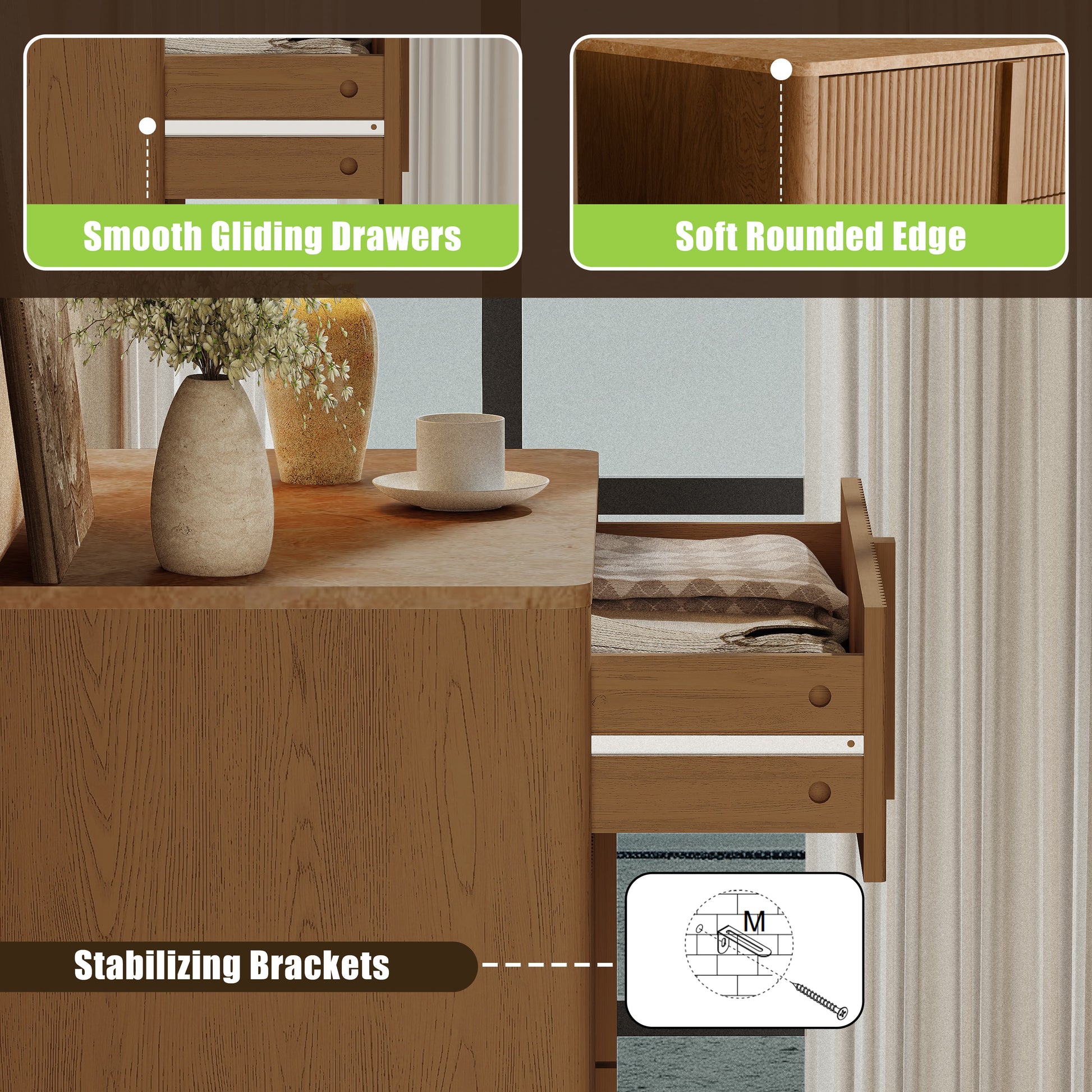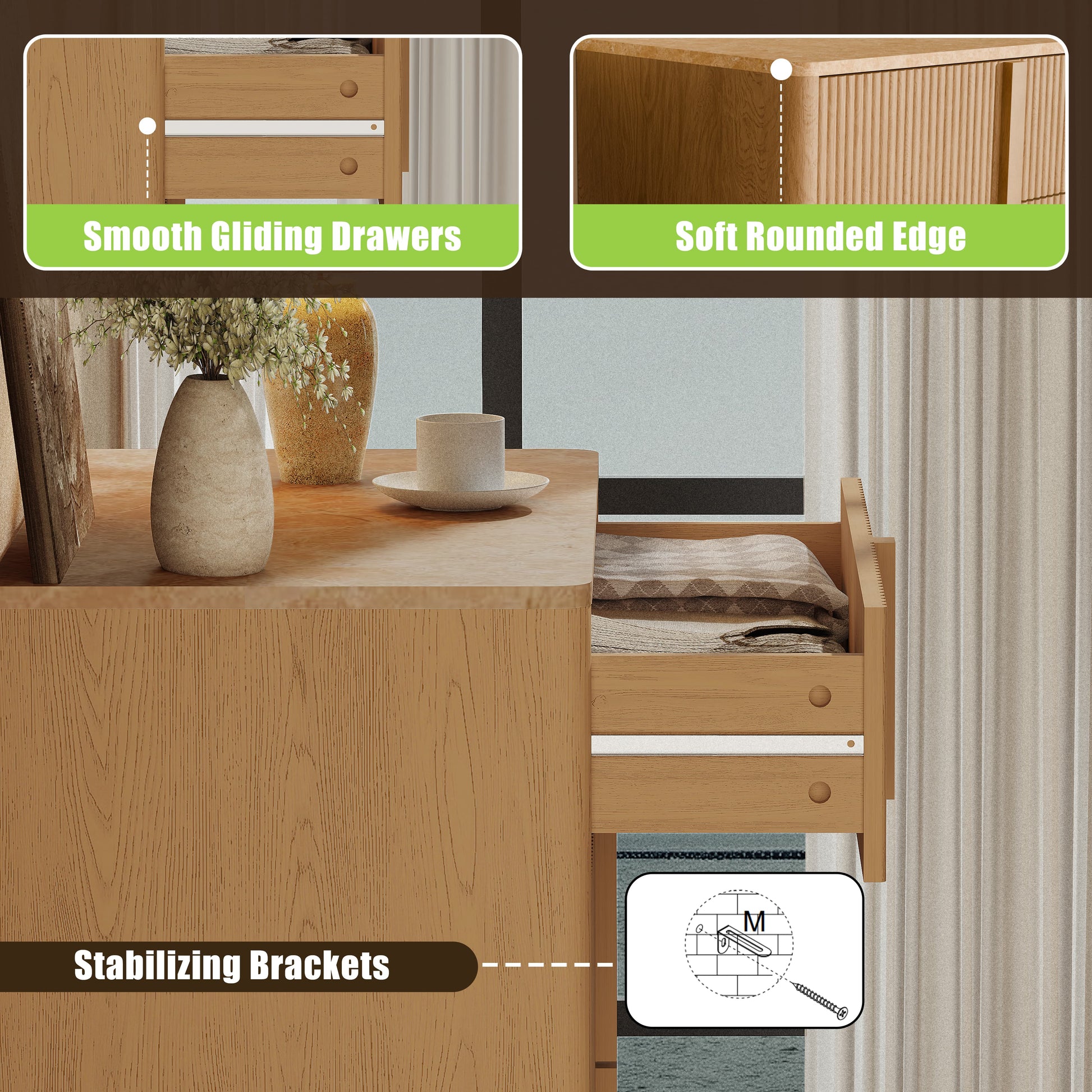- Durable Construction. Available in white oak, light oak, and natural oak finishes, natural wood console for bedroom includes safety-focused anti-tip hardware. Each drawer(27"D x 13"W x 5"H) features smooth-gliding mechanisms and wide wooden handles, while the reinforced base with adjustable leveling feet ensures stability on uneven flooring