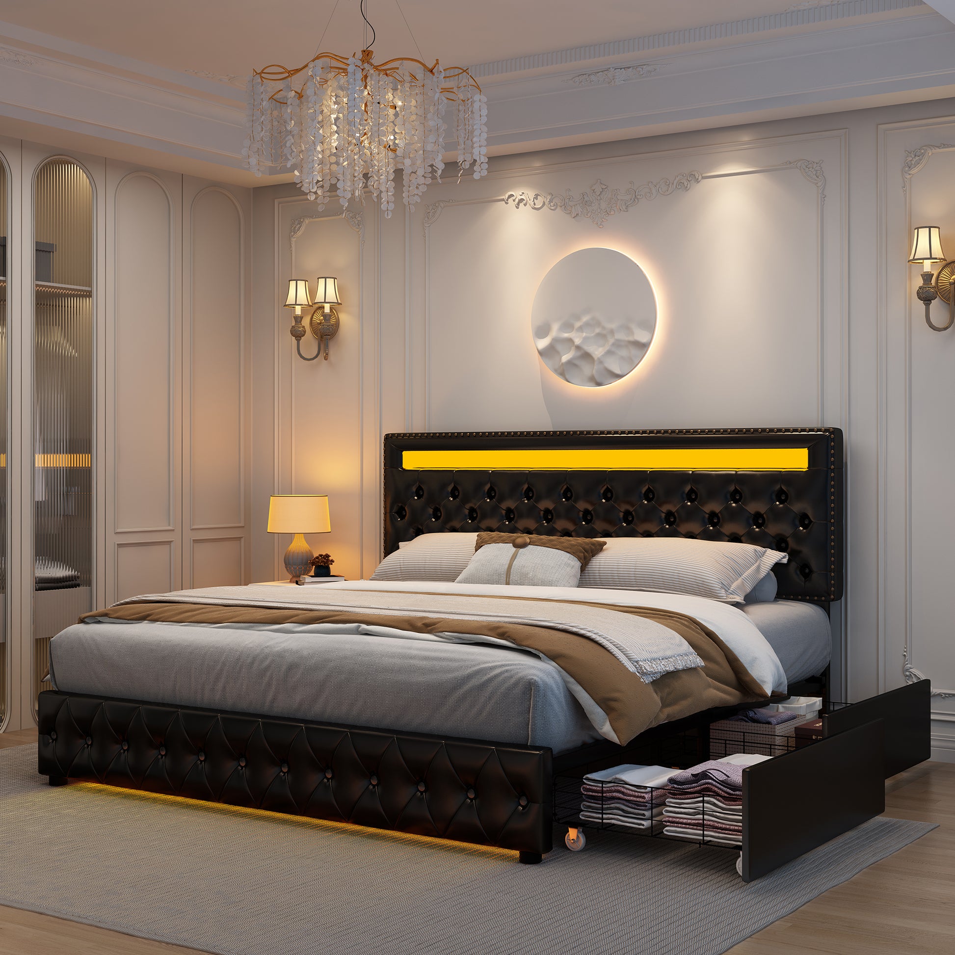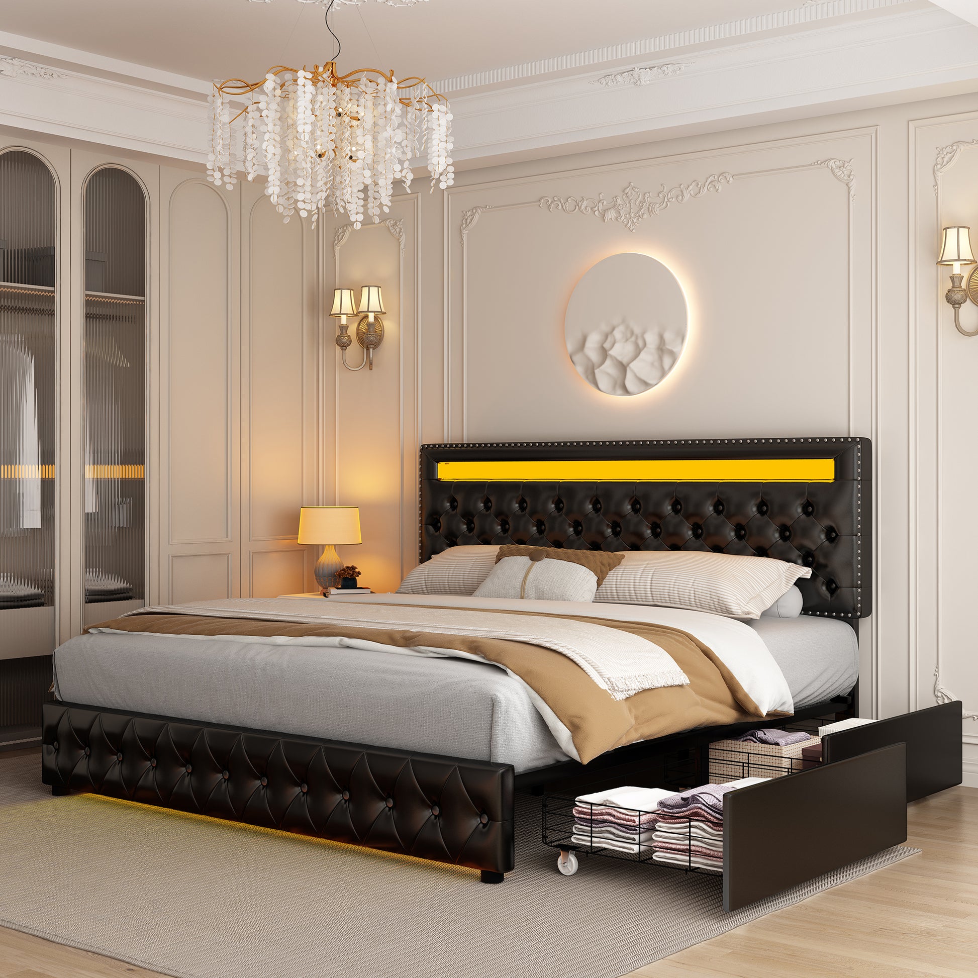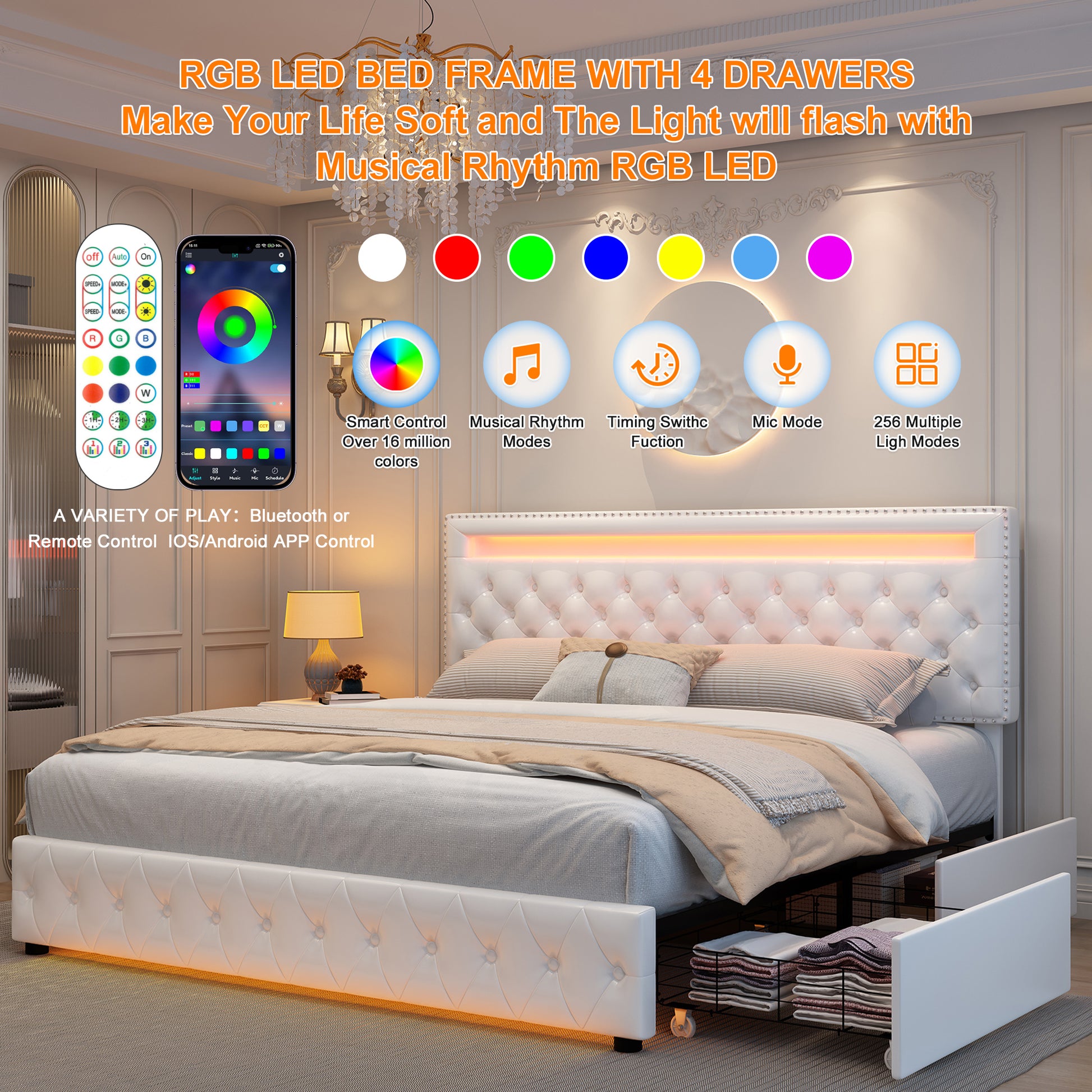 - King Led Bed Frame with 4 Storage Drawers: Equipped with four large-capacity storage drawers underneath the bed frame, each with four smooth wheels that can be easily pulled out and closed