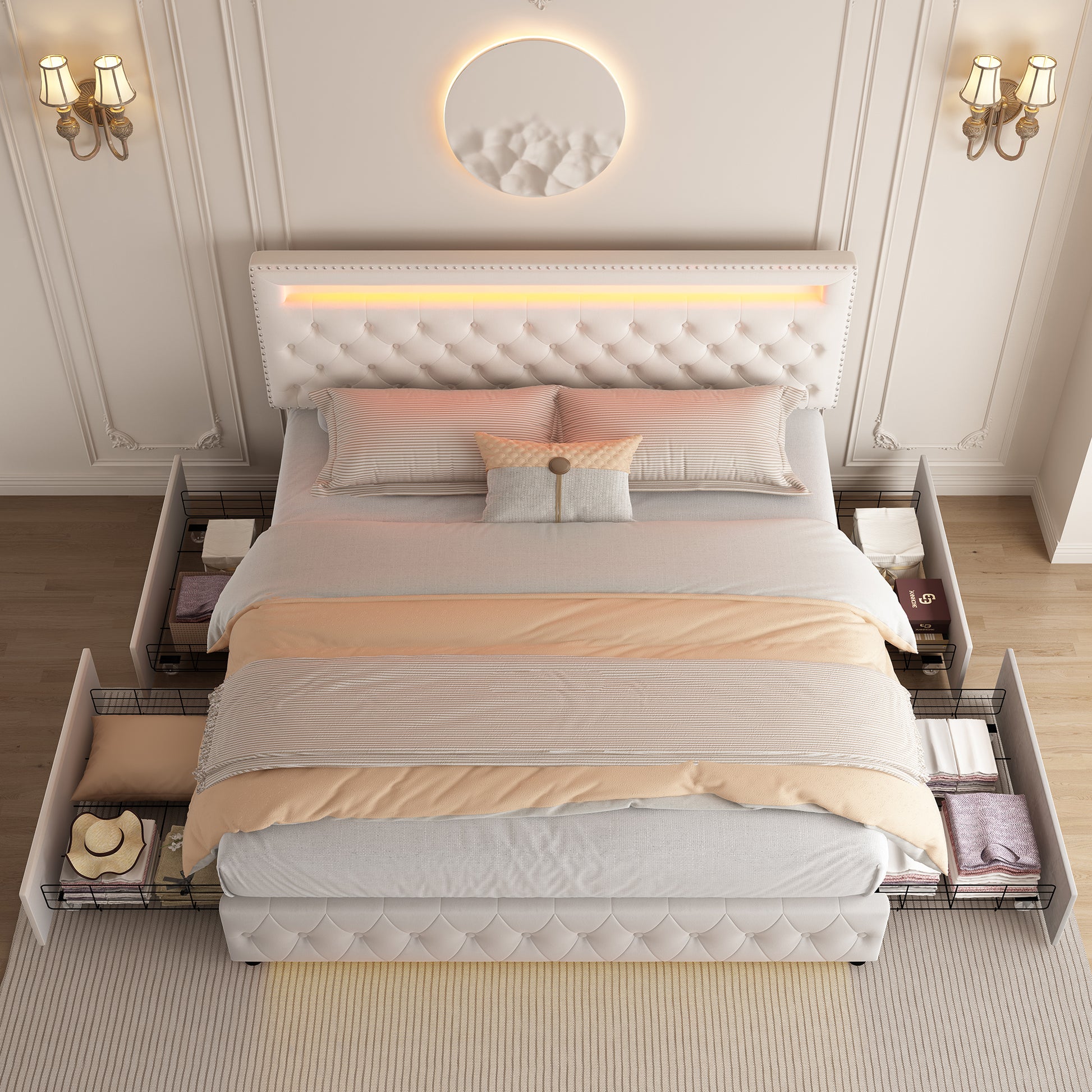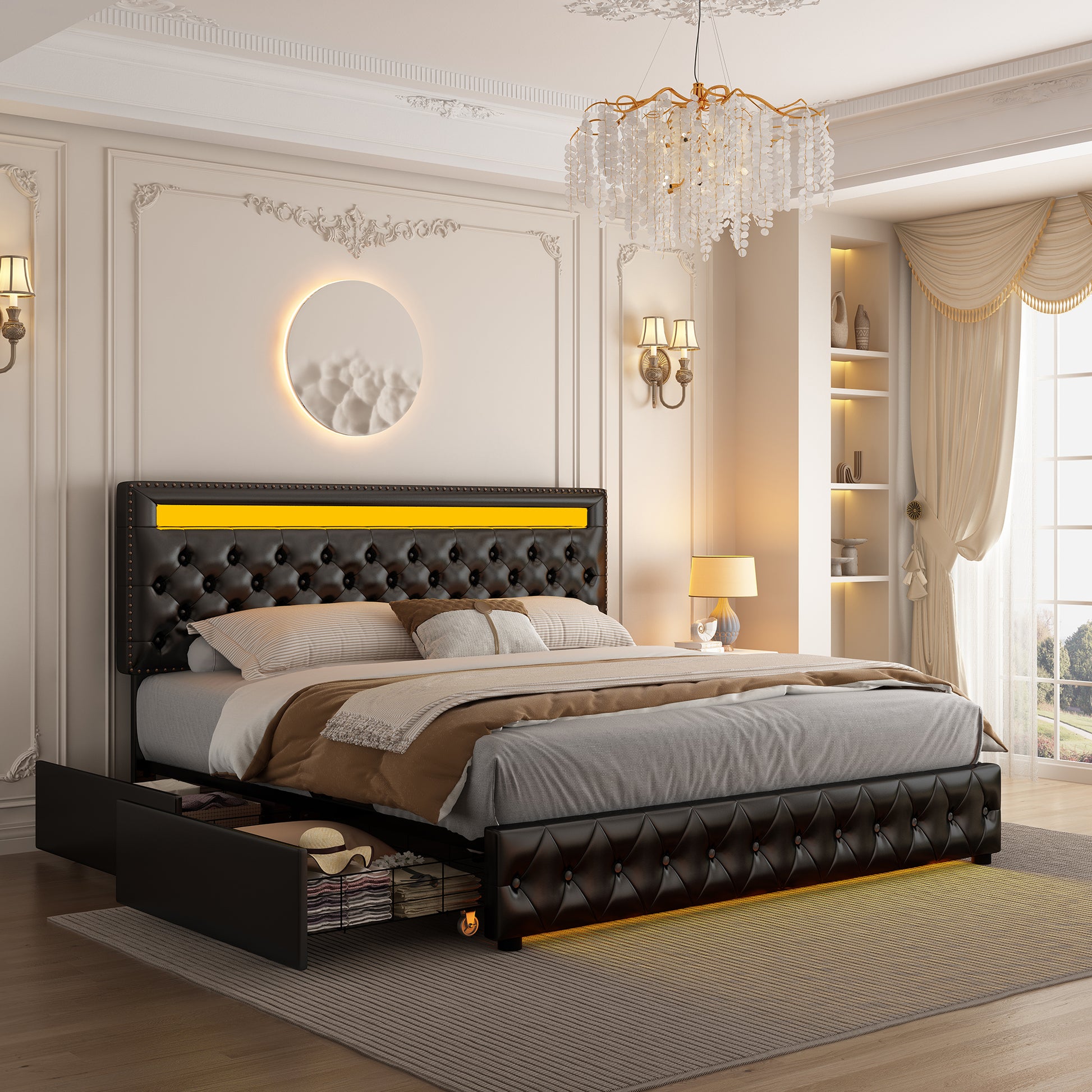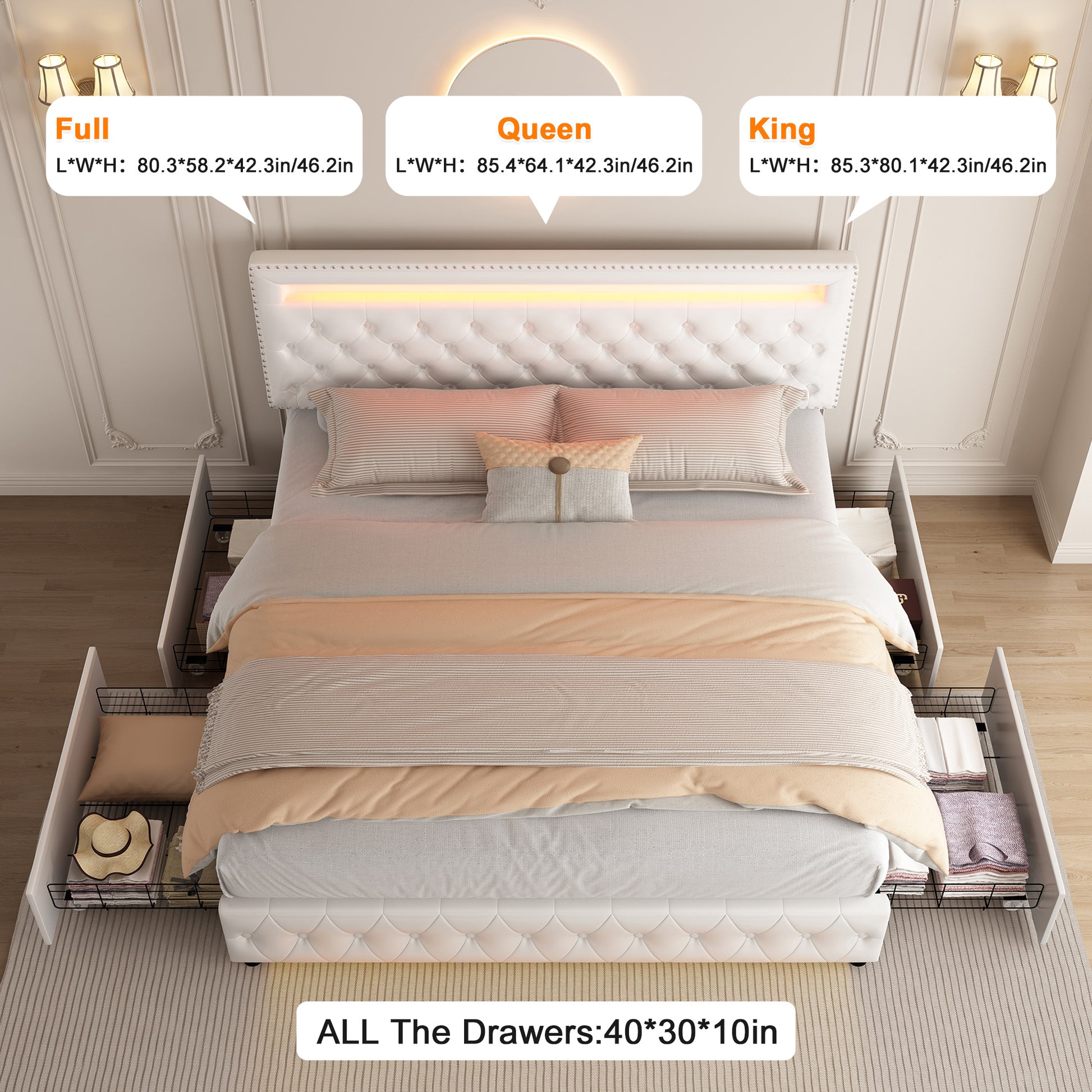 - King Led Bed Frame with 4 Storage Drawers: Equipped with four large-capacity storage drawers underneath the bed frame, each with four smooth wheels that can be easily pulled out and closed