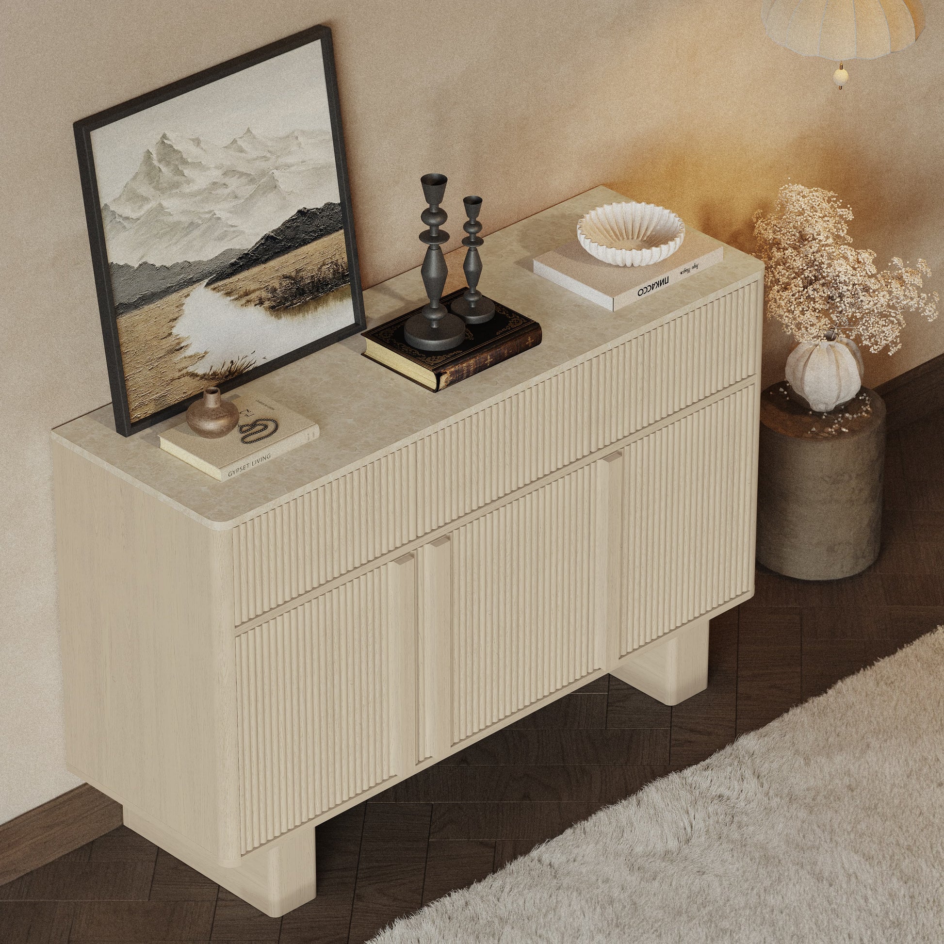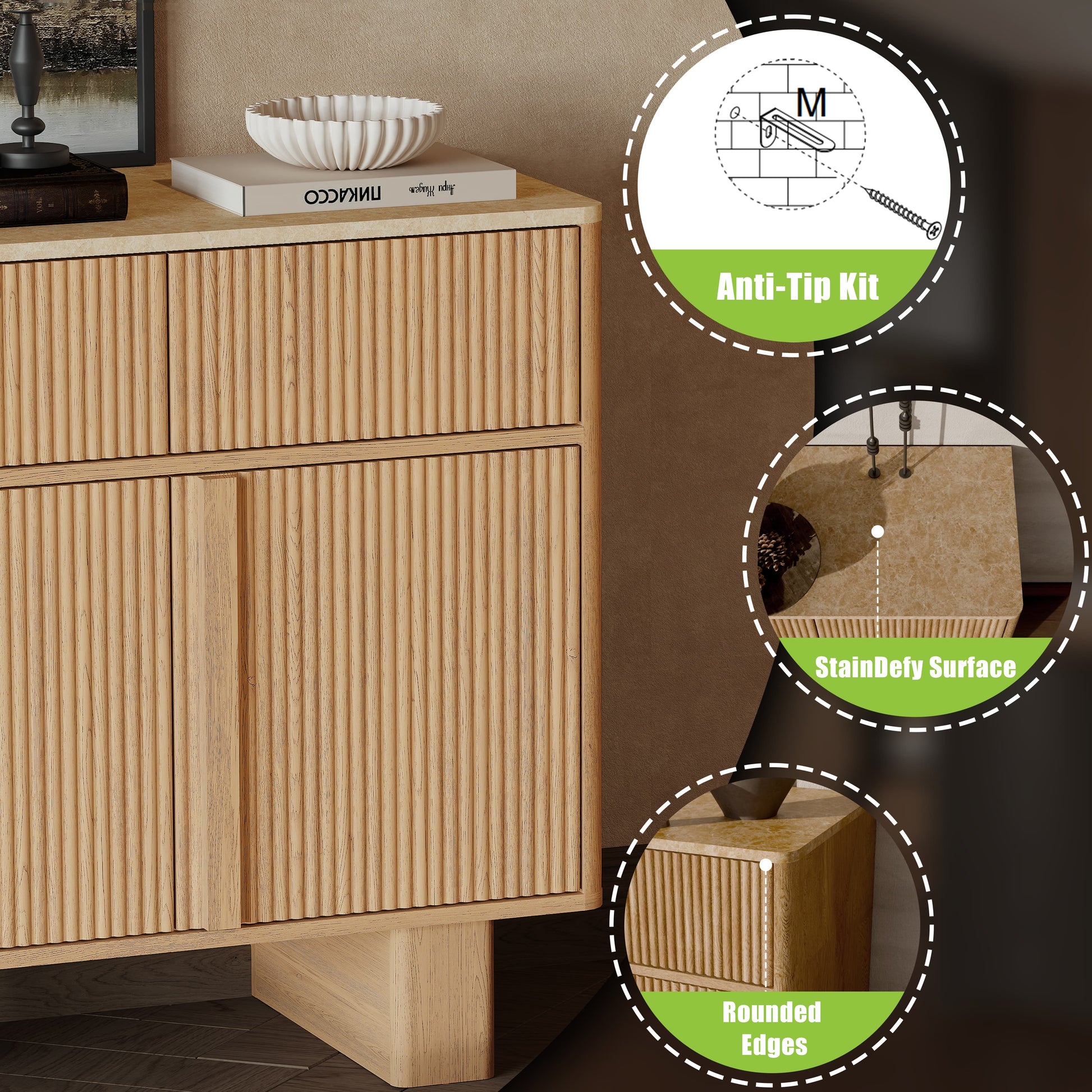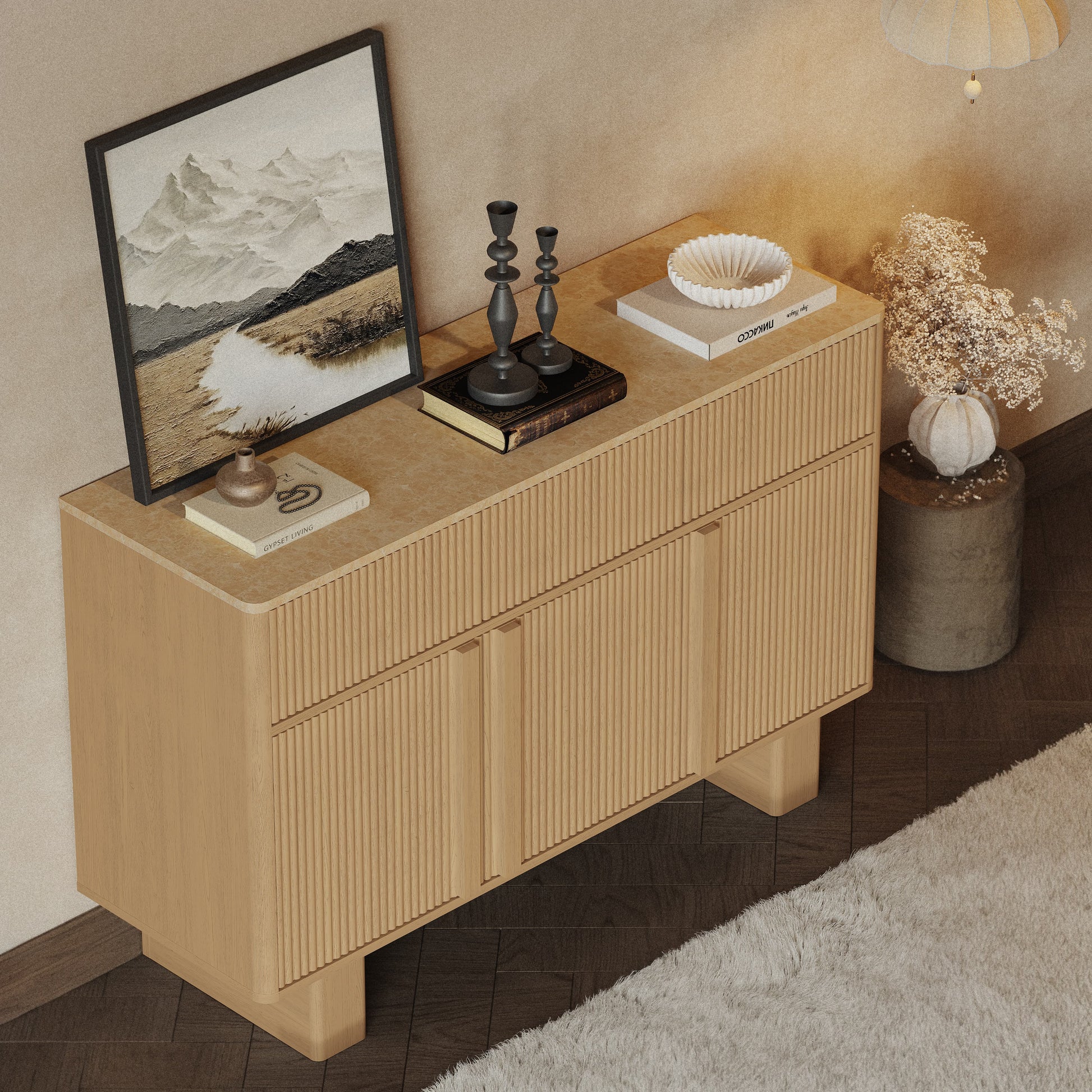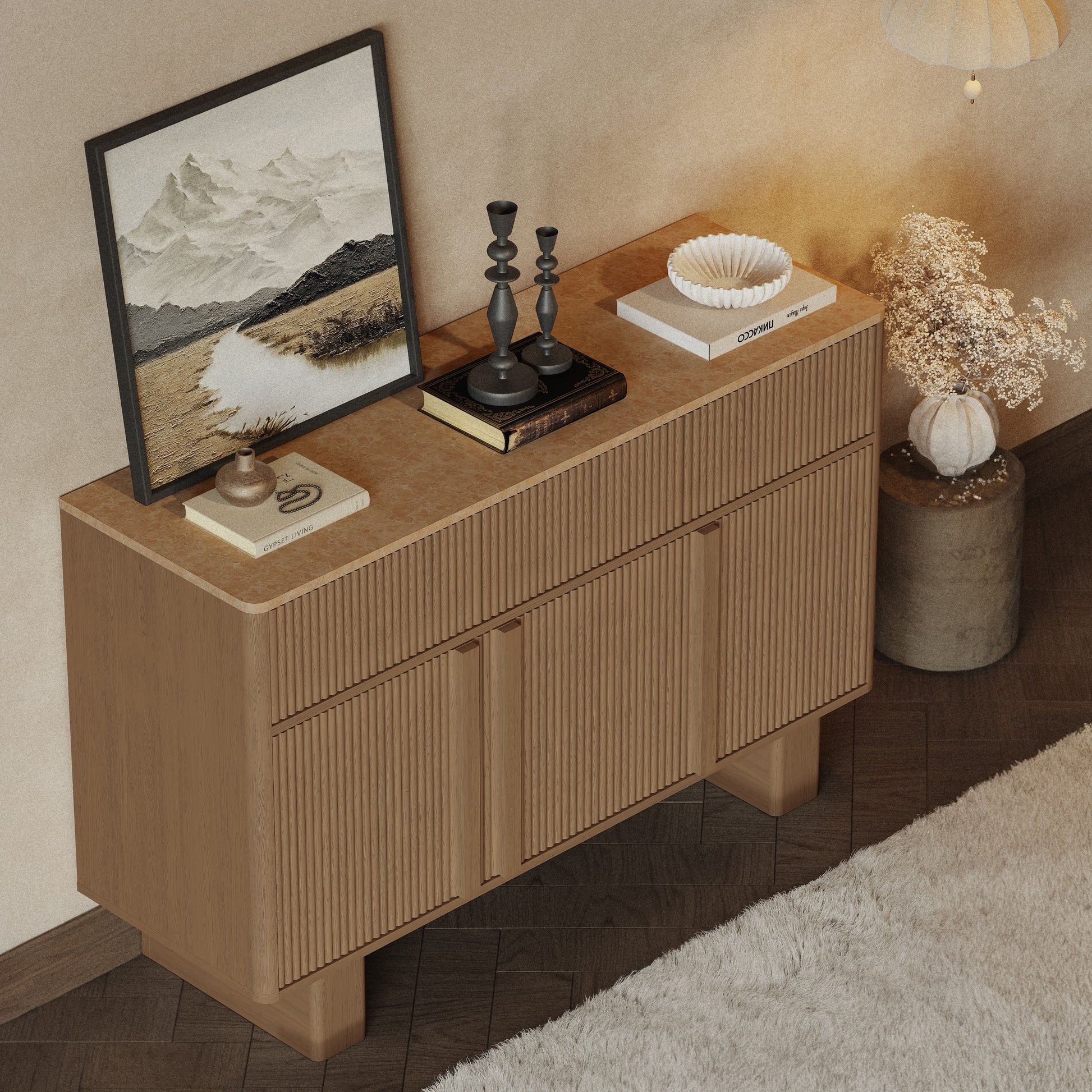 The arc-shaped buffet cabinet enhances the space with soft contours. Featuring 3D wave-groove detailing and marble veneers, crafted from durable engineered hardwood, it merges minimalist aesthetics with practicality. Rounded corners enhance safety, while its versatile design complements contemporary to mid-century styles.