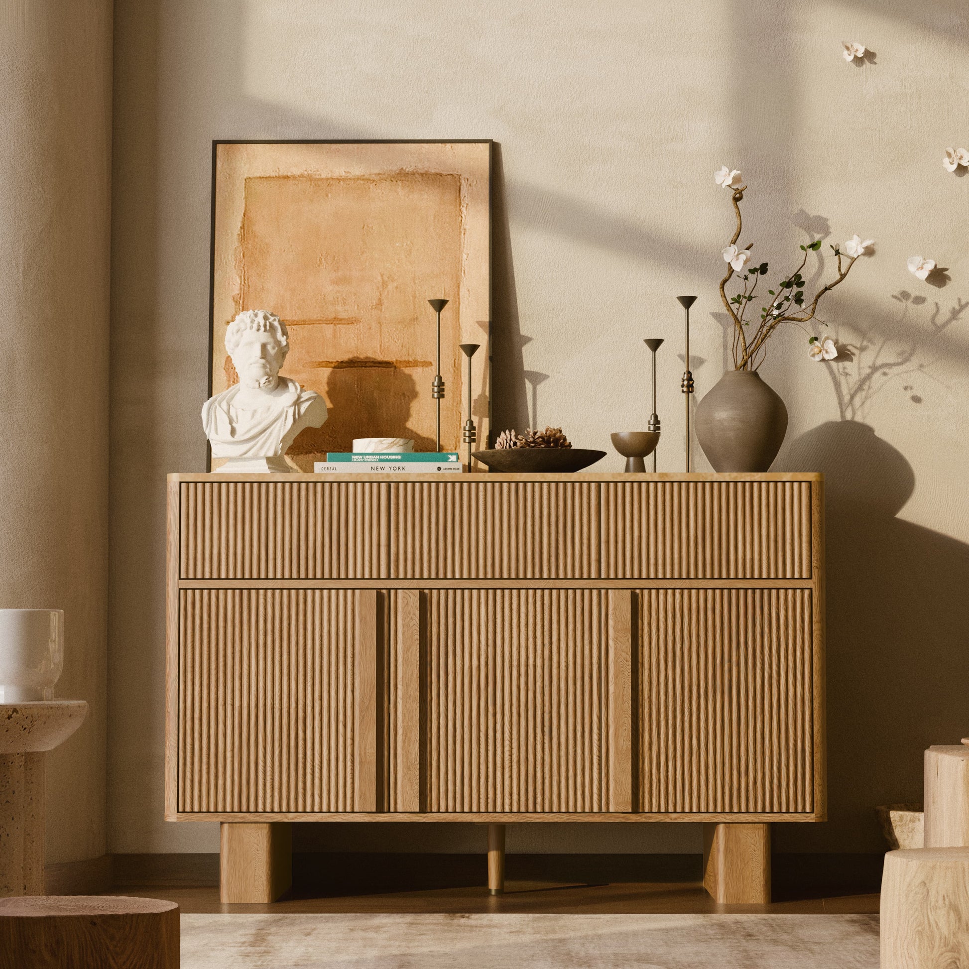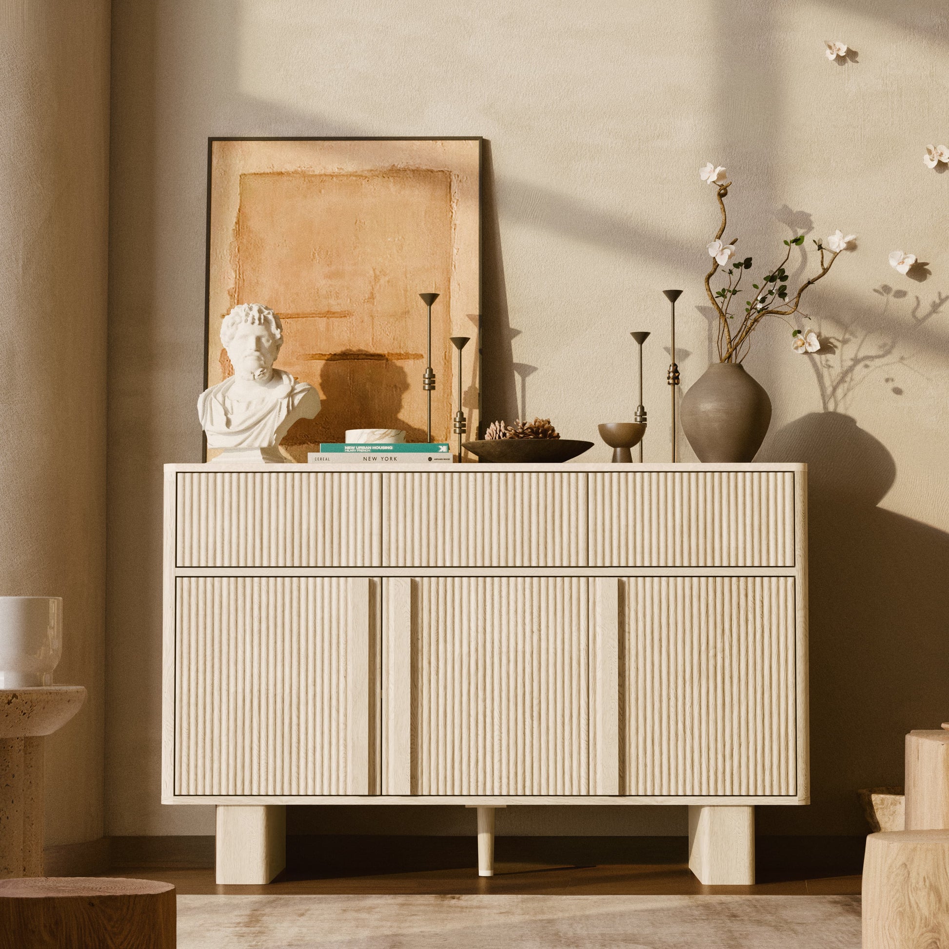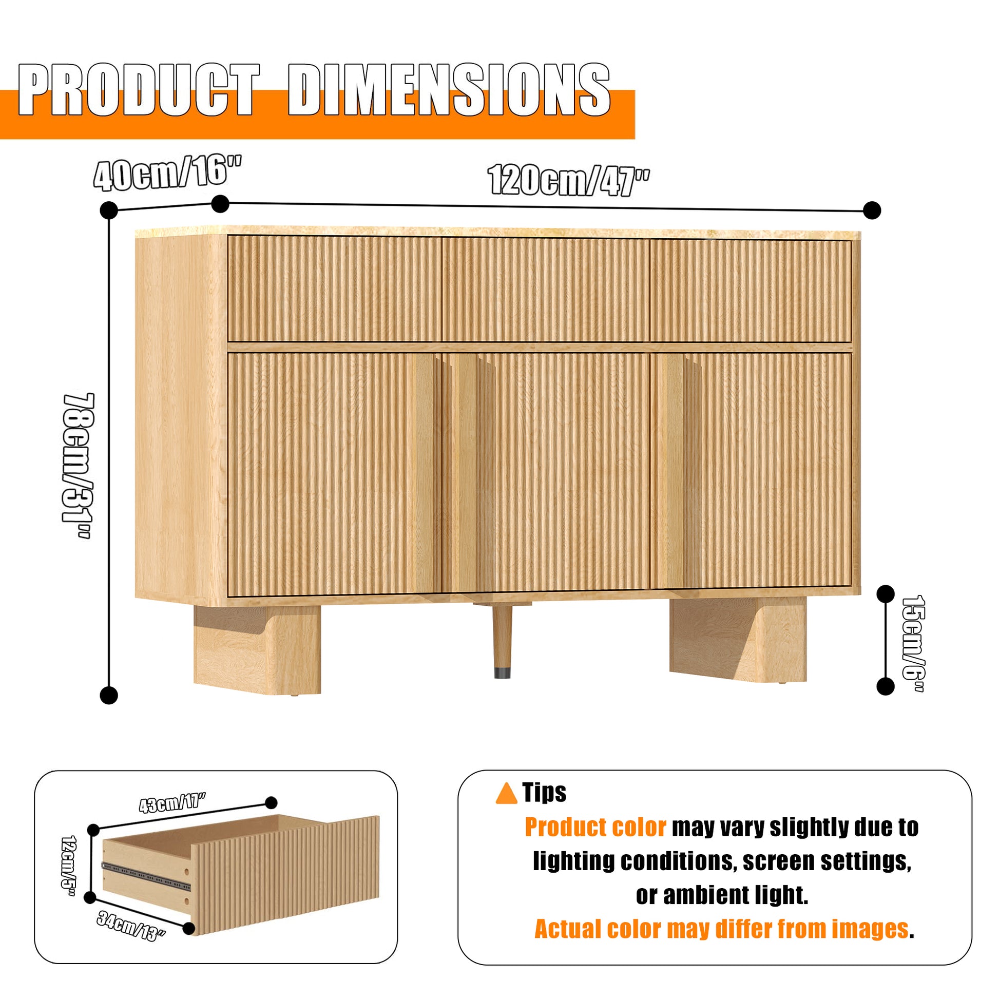 The arc-shaped buffet cabinet enhances the space with soft contours. Featuring 3D wave-groove detailing and marble veneers, crafted from durable engineered hardwood, it merges minimalist aesthetics with practicality. Rounded corners enhance safety, while its versatile design complements contemporary to mid-century styles.