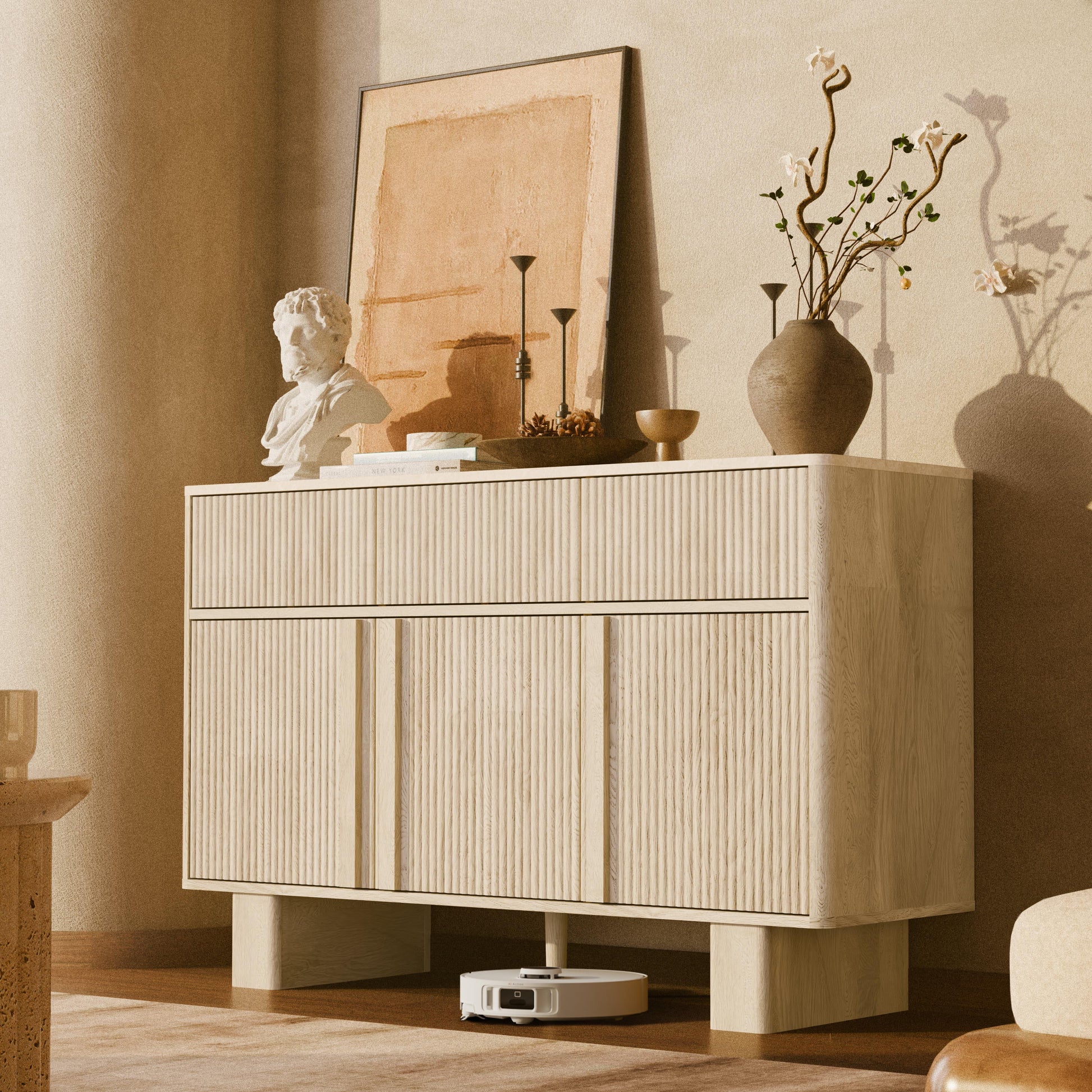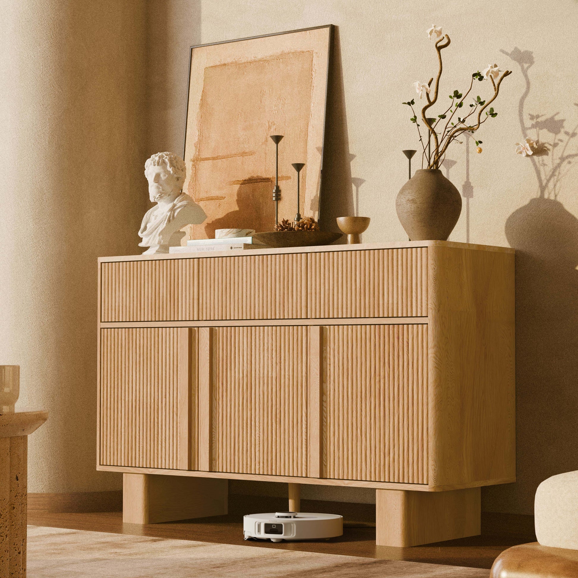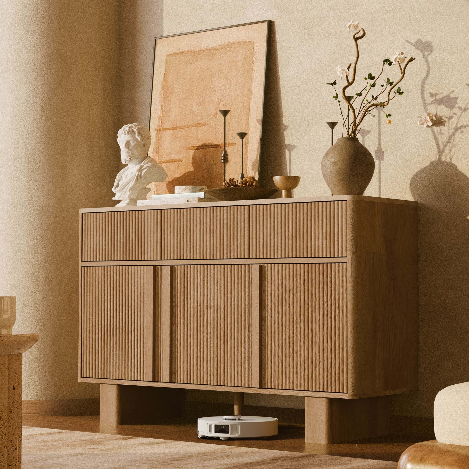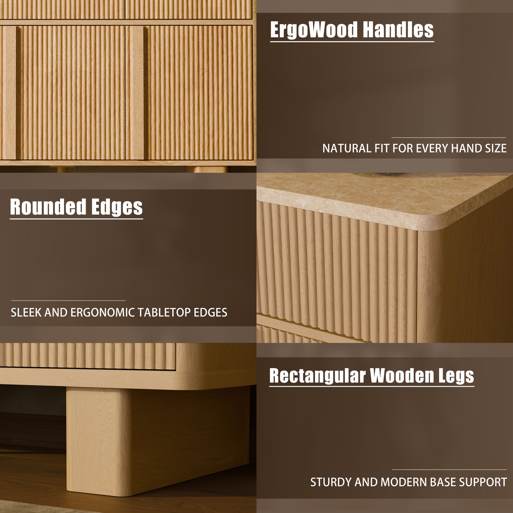 The arc-shaped buffet cabinet enhances the space with soft contours. Featuring 3D wave-groove detailing and marble veneers, crafted from durable engineered hardwood, it merges minimalist aesthetics with practicality. Rounded corners enhance safety, while its versatile design complements contemporary to mid-century styles.