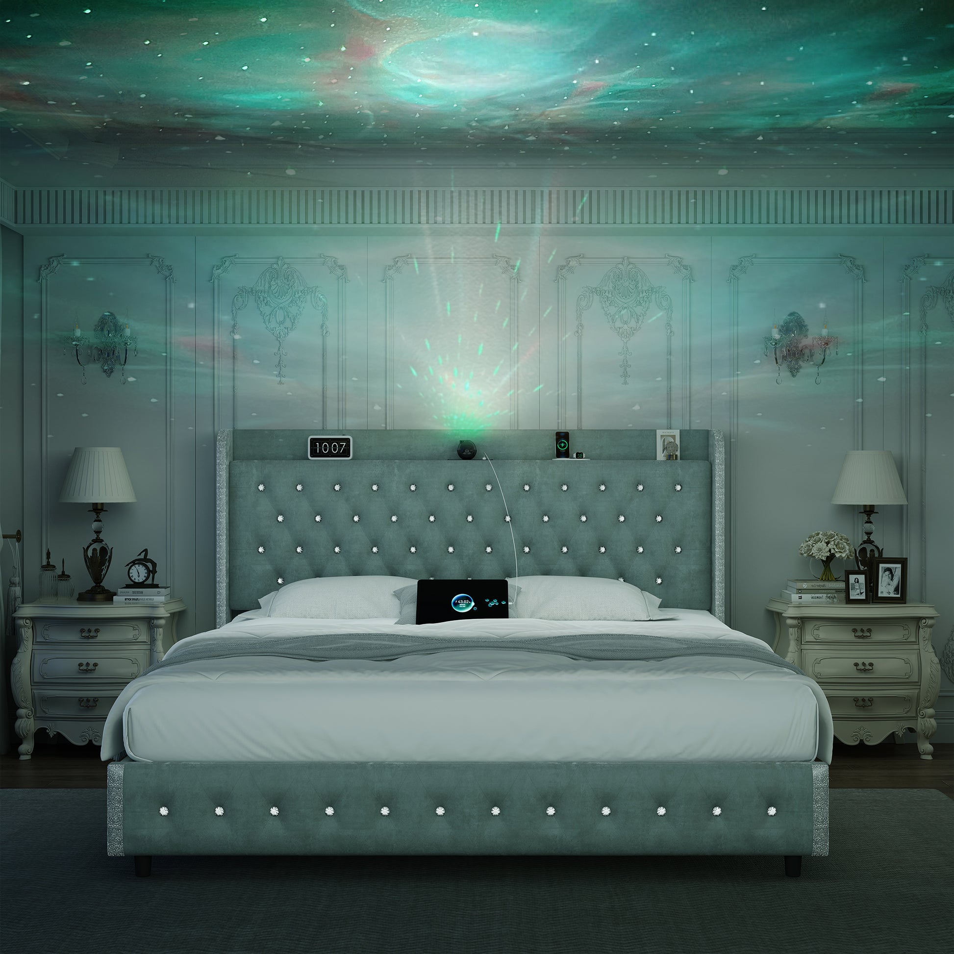 Elevate your bedroom décor with this elegant gray velvet bed frame, highlighted by a headboard adorned with crystal buttons and shimmering silver star decorations on the side panels and footboard.
