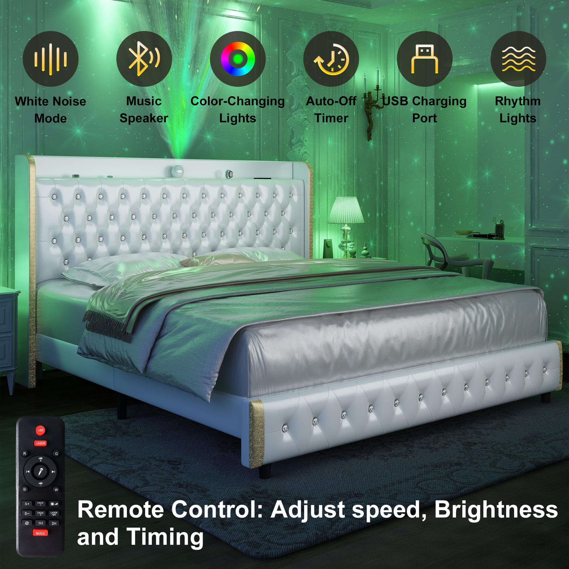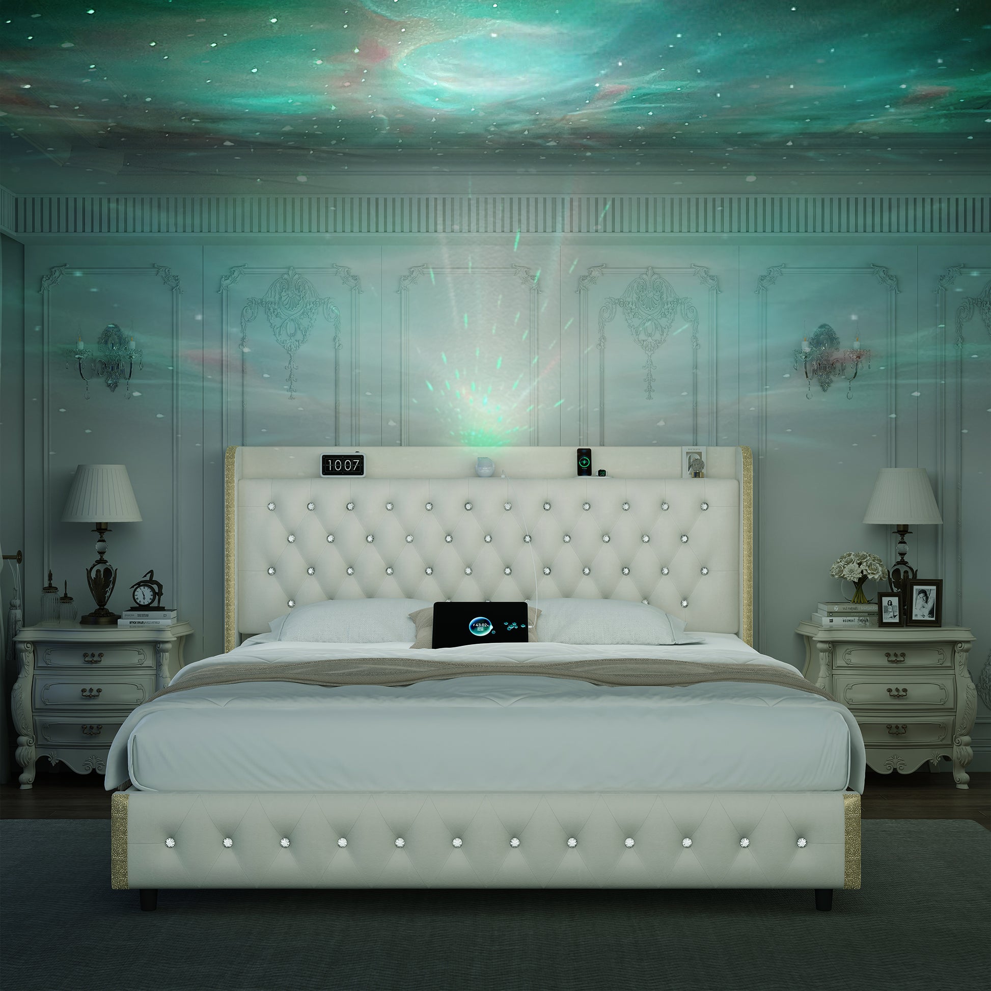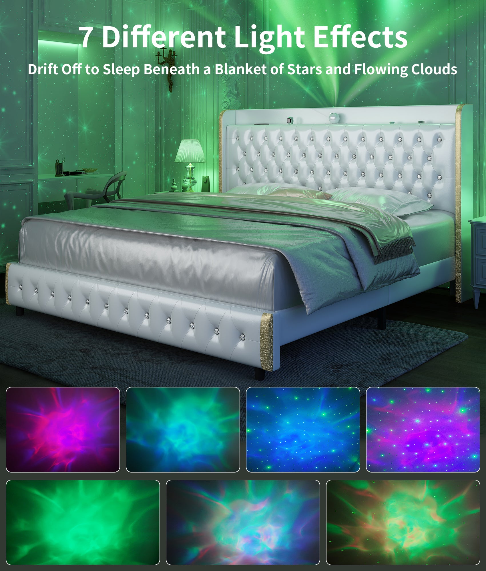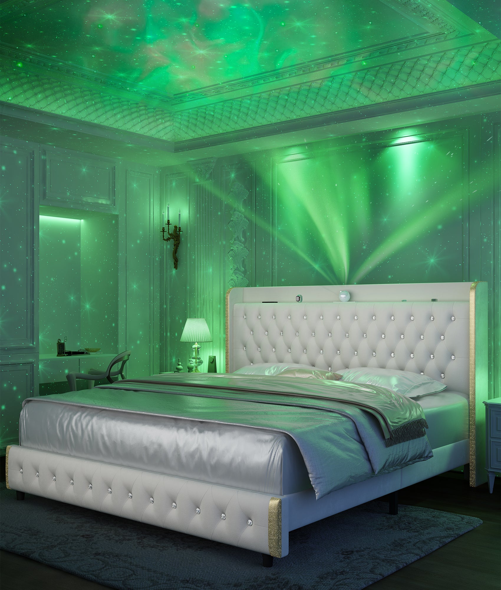 A built-in starry night light provides a tranquil and romantic setting, casting stars and auroras that sync with your music via Bluetooth. The bed also features white noise and a USB charging port.